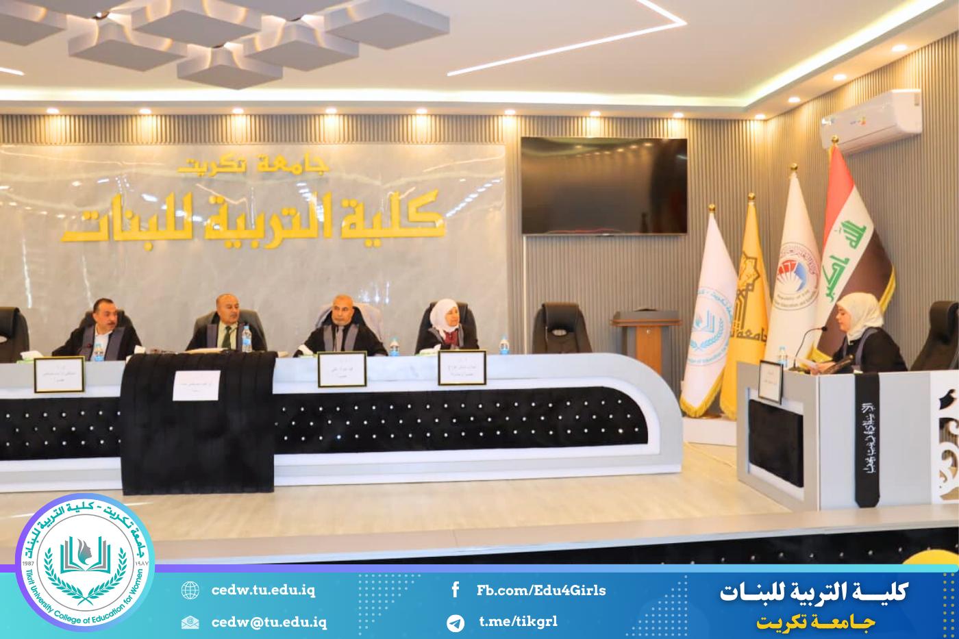 لكلية التربية للبنات مكانة علمية رفيعة فهي إحدى أهم معالم الدراسات الأكاديمية للأقسام الإنسانية والعلمية في جامعة تكريت ، وتقع في وسط مدينة تكريت خارج الحرم الجامعي ، وتضم بنايتين أحداهما تضم الأقسام العلمية والأخرى للأقسام الإنسانية والتي فيها المقر الإداري لعمادة الكلية .تأسست الكلية في العام الذي تأسست فيه جامعة تكريت وهو عام 1987 ، وكانت بمثابة نواة لها وهي بذلك تعدّ أقدم مؤسسة علمية بين أقرانها، وقد أطلق عليها اسم الكلية الأم تيمناً بذلك فغدت معلماً بارزاً لتحقيق أهداف وطموحات وخطط التعليم العالي القائمة على إعداد كادر  نسوي يضطلع بمهام التعليم الثانوي في عموم القطر إلى جانب إعداد باحثين متخصصين في المجال العلمي والإنساني وباختصاصات متنوعة لأقسامها الثمانية حتى أضحت رافداً مهماً لإعداد ملاكات علمية وطنية مقتدرة تصب في حركة البحث العلمي وخدمة المجتمع المحلي والعربي تم قبول الطالبات فيها في العام الدراسي 1988- 1989، ولثلاثة أقسام  هي الرياضيات واللغة العربية واللغة الانكليزية ، ثم تلتها أقسام الكيمياء وعلوم الحياة ثم علوم القرآن والعلوم التربوية والنفسية و قسم التأريخ وأخيراً قسم الاقتصاد المنزلي الذي يعدّ التفسير الفعلي لمعنى (كلية التربية للبنات) . وتحوي الكلية مرافق متعددة ففيها  مكتبة ضخمة تحوي مجاميعاً من الكتب والمطبوعات والمواد الثقافية اأخرى ، فهي تحوي (15575) كتاباً، و(265) دورية، و(1204 )رسالة وأطرروحة و (175 ) قرصاً مضغوطاً
