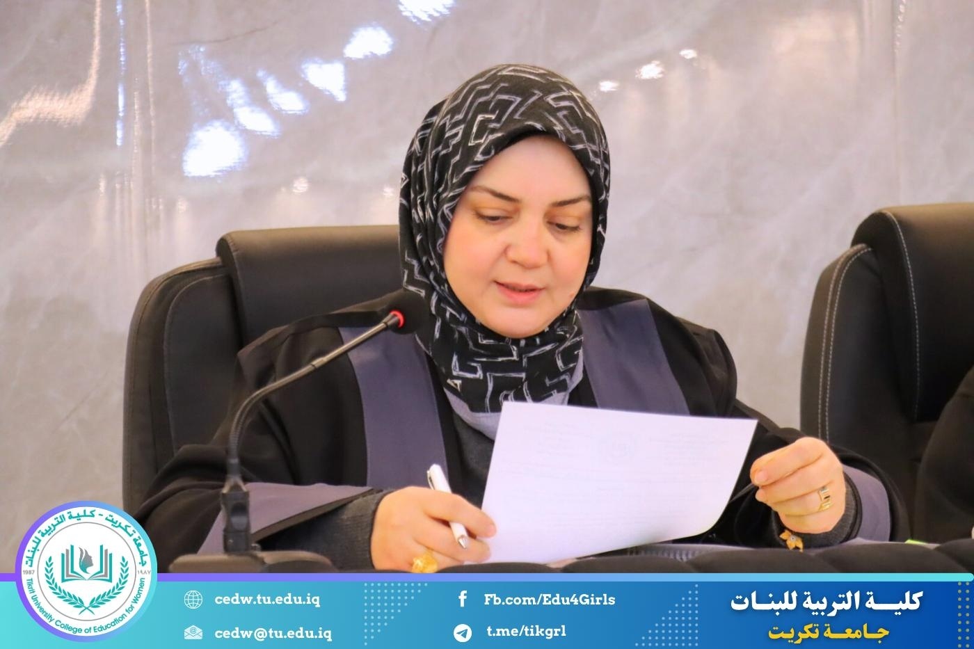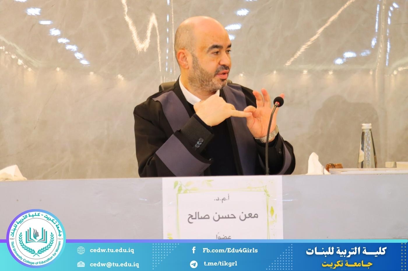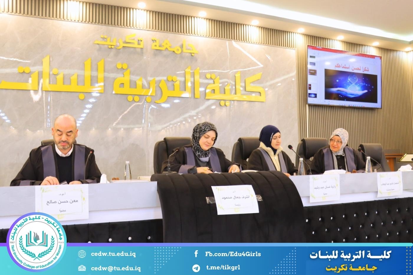 وقد حضر المناقشة السيدة عميد كلية التربية للبنات الأستاذ الدكتورة نجلاء عبدالحسين عليوي، والسيدة معاون العميد للشؤون الإدارية الأستاذ المساعد الدكتورة سلمى خالد ياسين، وعدد من السادة التدريسيين في الكلية