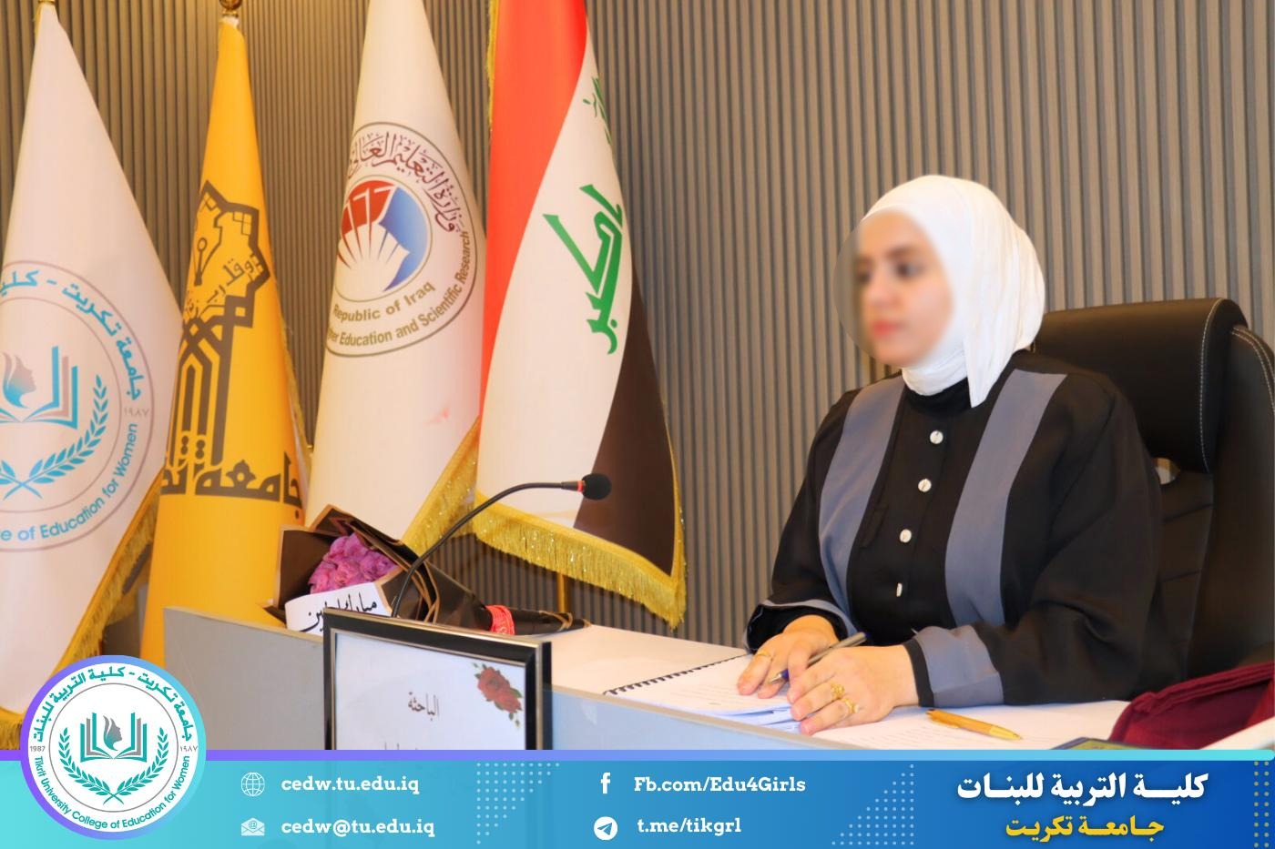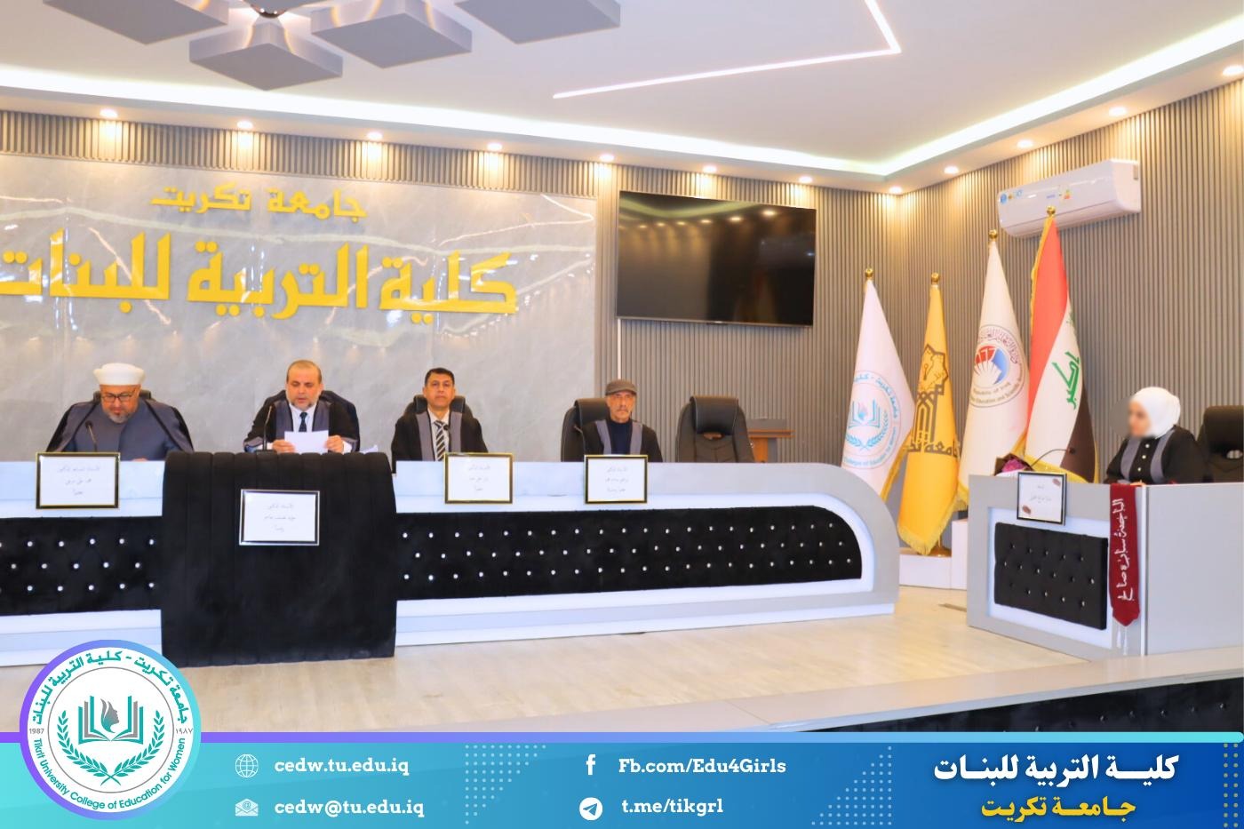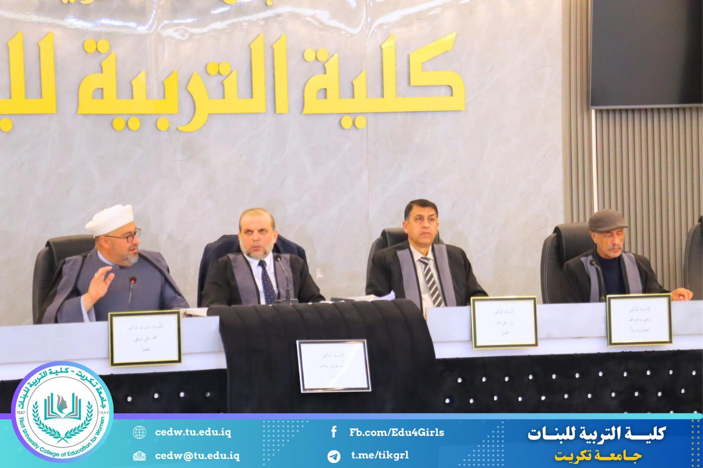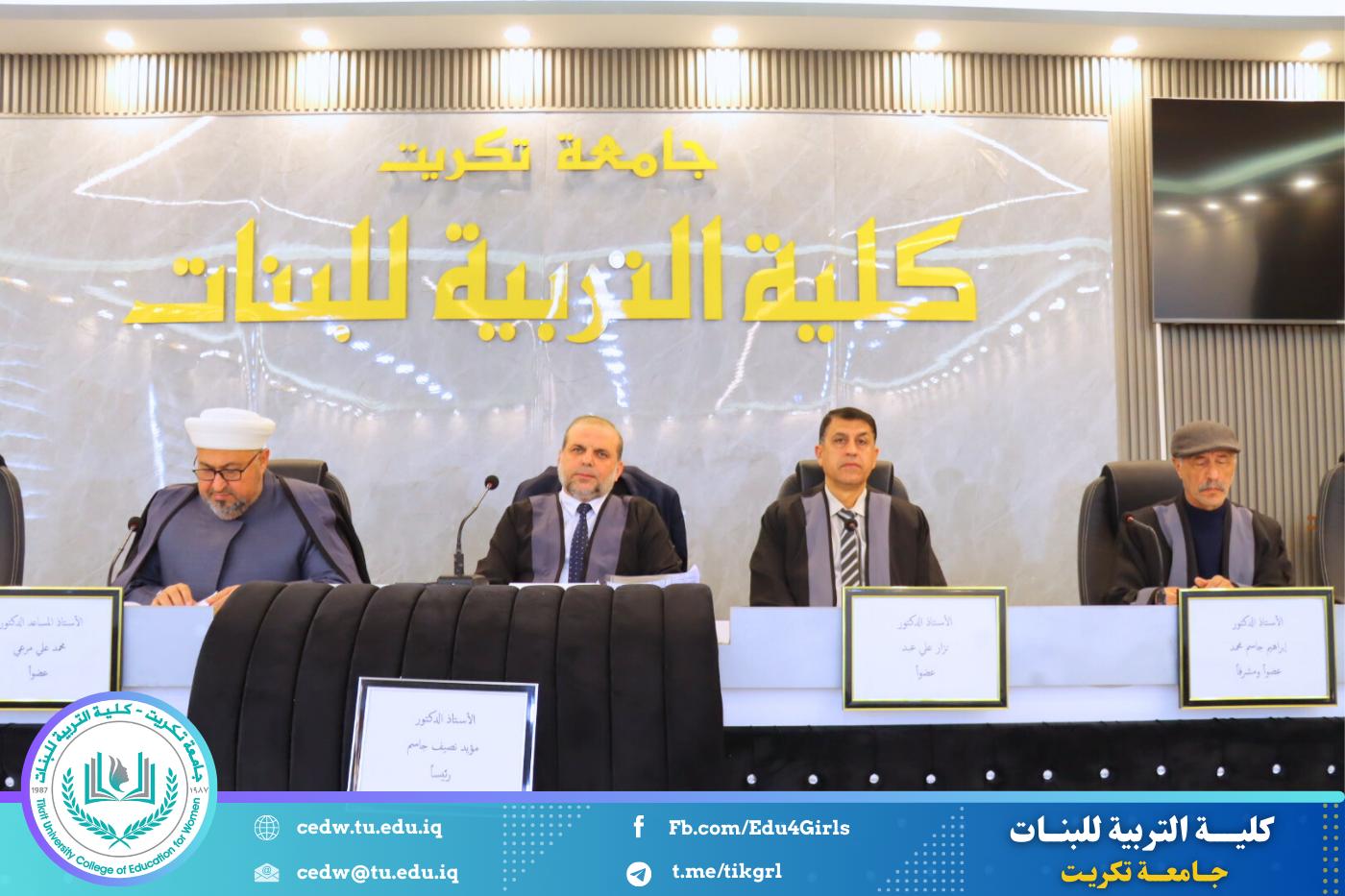 نوقشت في كلية التربية للبنات – قسم علوم القرآن، يوم الثلاثاء الموافق 24 / 2 / 2026، وعلى قاعة المرحوم الأستاذ الدكتور جايد زيدان في عمادة الكلية، رسالة الماجستير المقدّمة من الطالبة سارة صالح حمد، والموسومة: