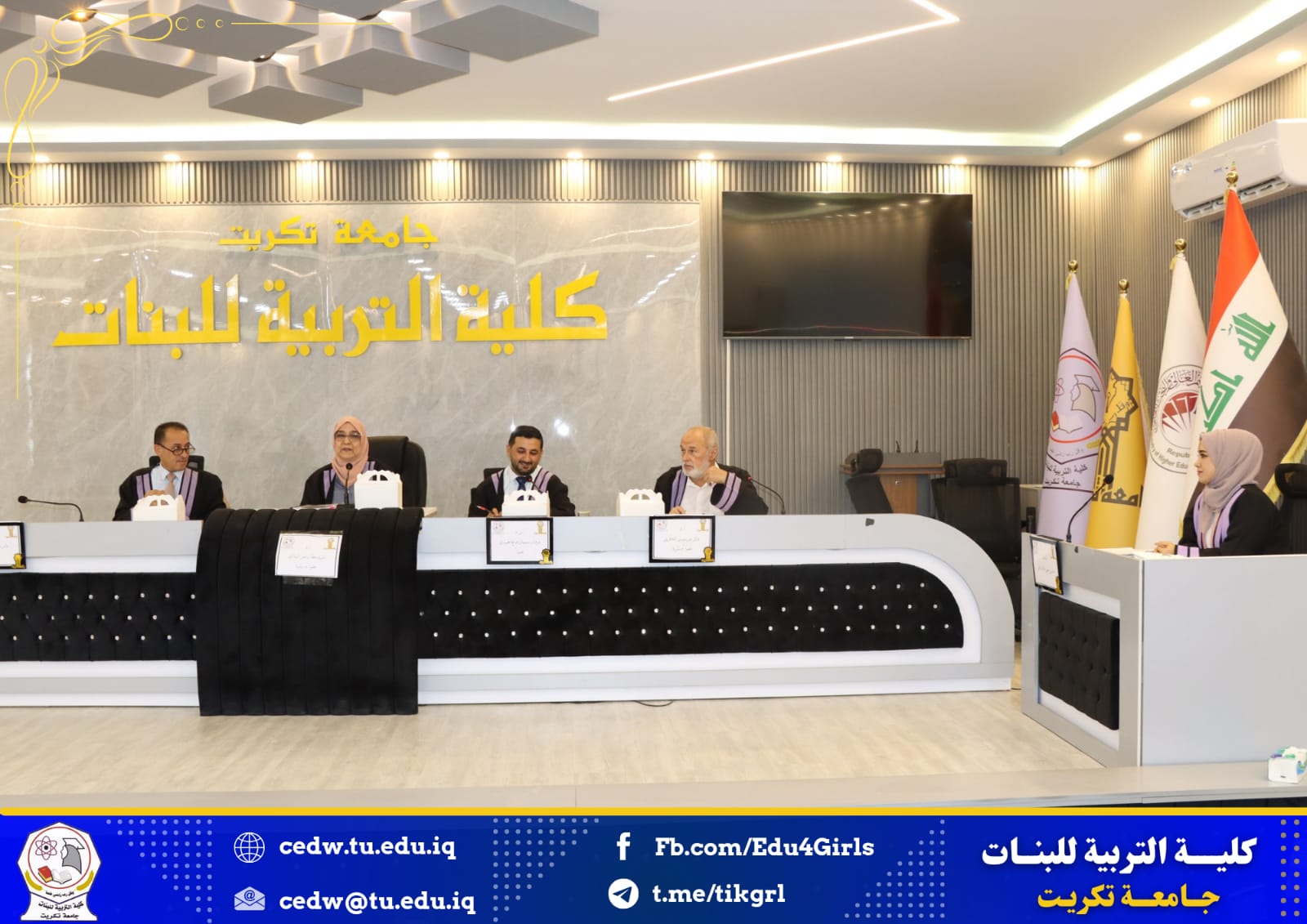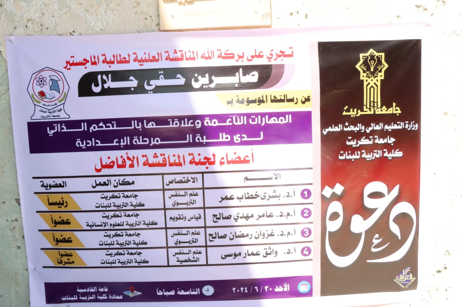 نوقشت في كلية التربية للبنات قسم العلوم التربوية والنفسية يوم الاحد الموافق 30- 6- 2024 وعلى رحاب قاعة القادسية في عمادة الكلية رسالة ماجستير للطالبة صابرين حقي جلال والموسومة المهارات الناعمة لدى طلبة المرحلة الإعدادية