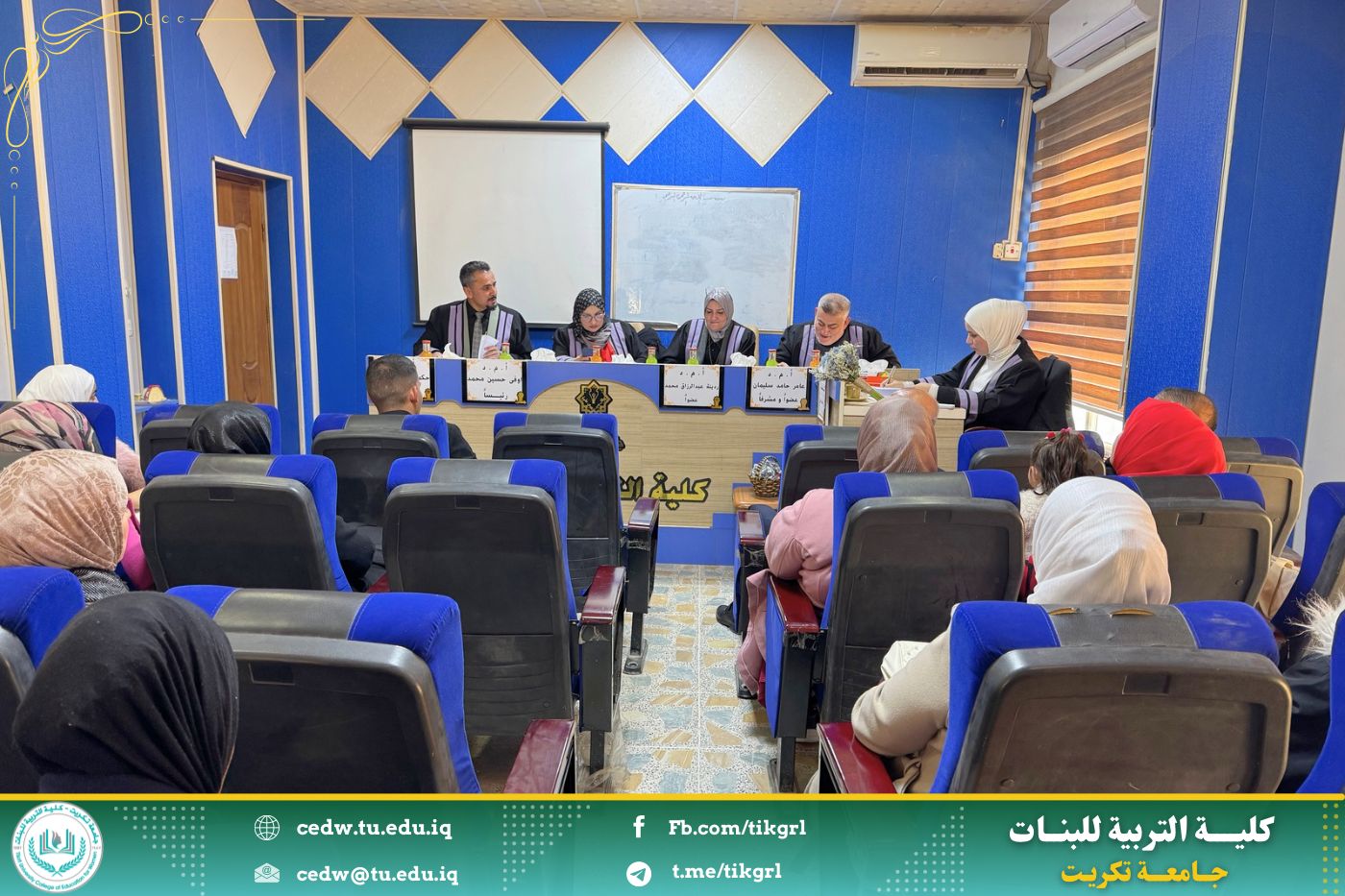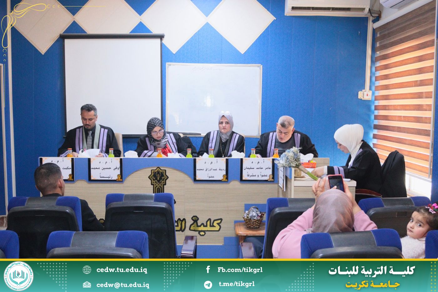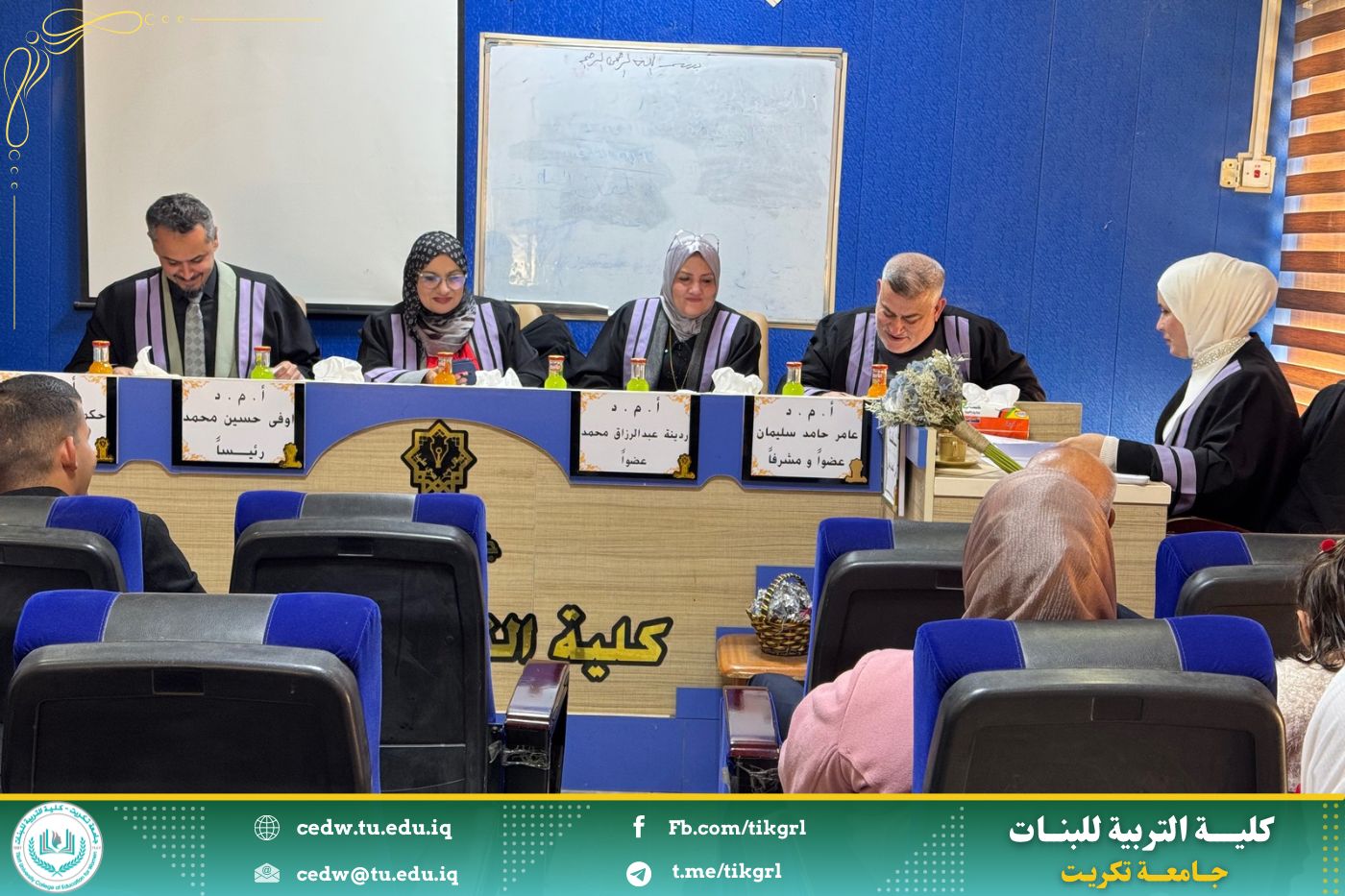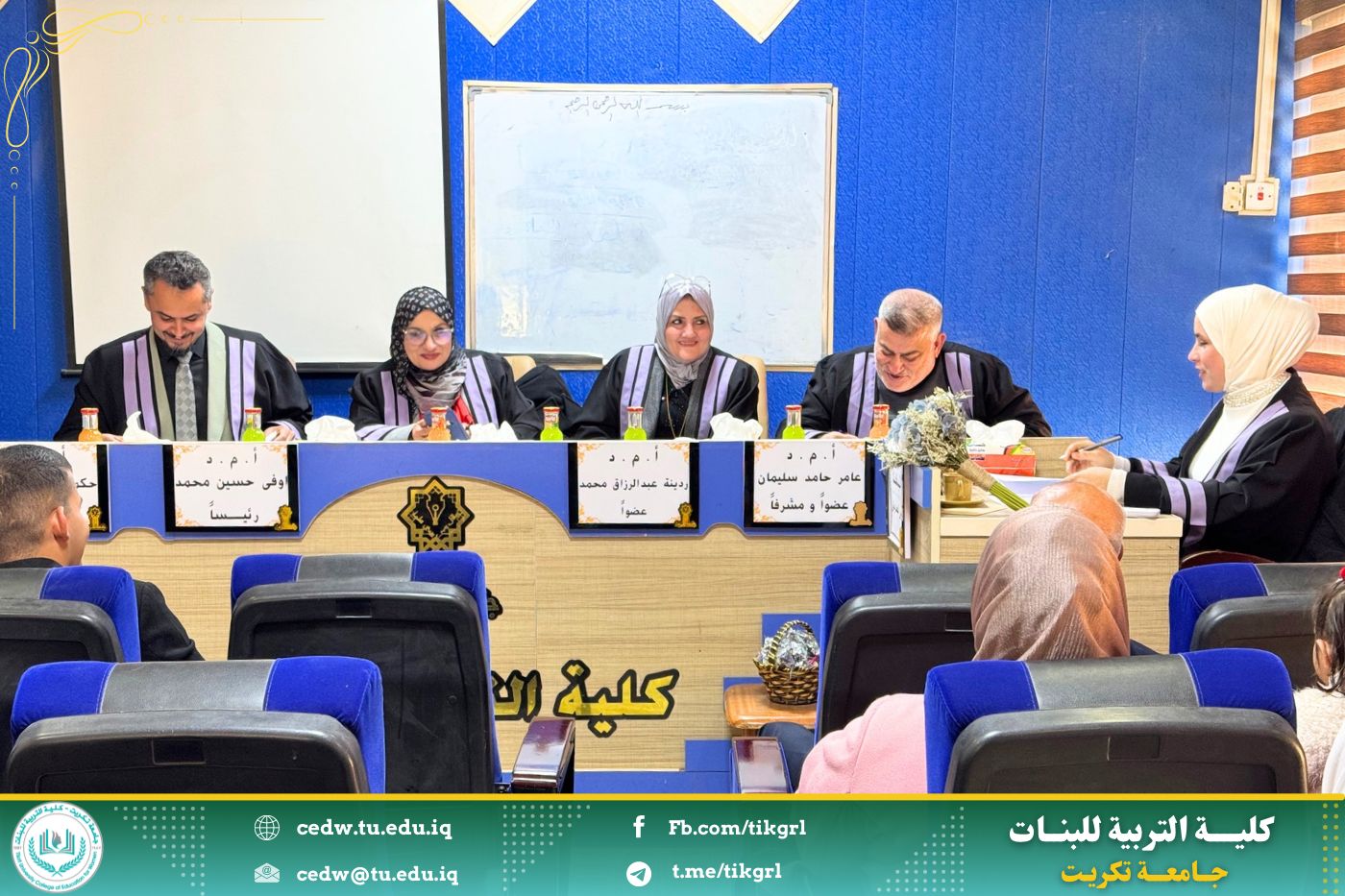 نوقشت في كلية التربية للبنات جامعة تكريت قسم اليوم الأربعاء الموافق ٢٦ / ٢ / ٢٠٢٥ ، وعلى رحاب قاعة المرحوم الأستاذ الدكتور جايد زيدان
