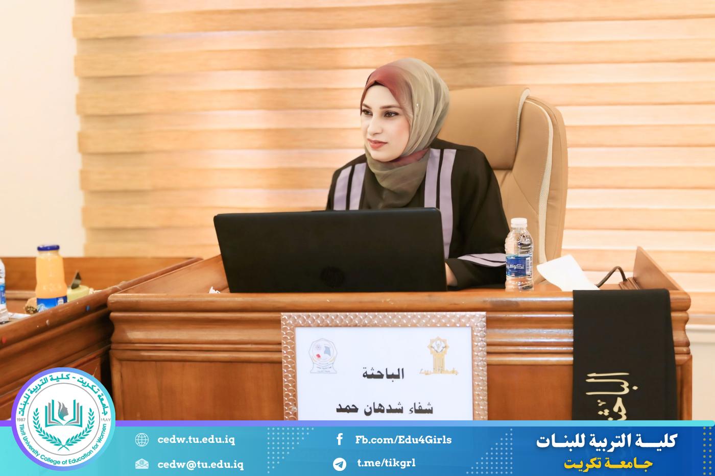 نوقشت في كلية التربية للبنات – قسم الكيمياء، اليوم الثلاثاء الموافق 26 / 8 / 2025، على قاعة السمنار في الأقسام العلمية، رسالة الماجستير المقدمة من الطالبة شفاء شدهان حمد، والموسومة: