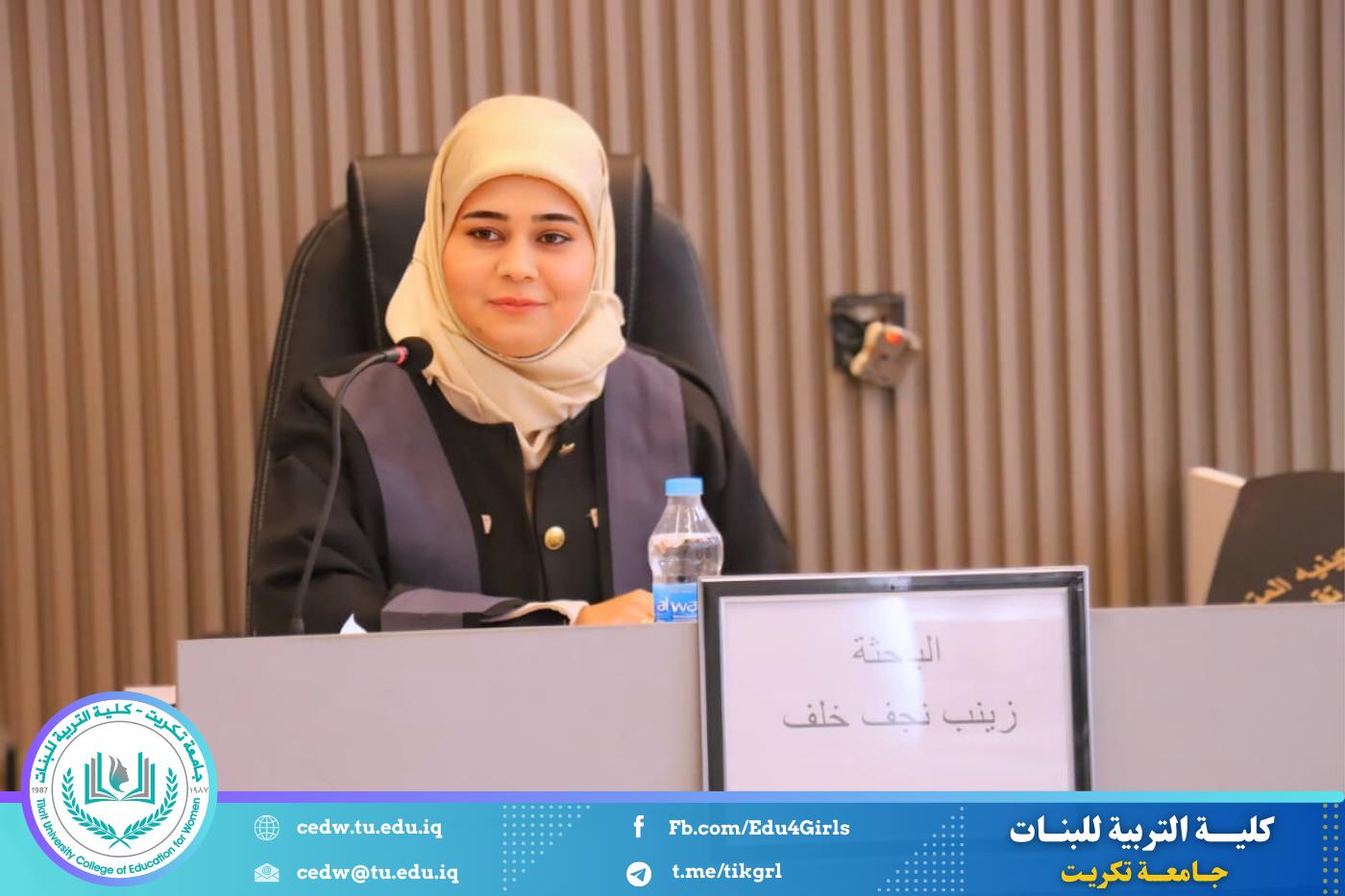 نوقشت في كلية التربية للبنات – قسم اللغة العربية، يوم الخميس الموافق (27 / 11 / 2025)، على قاعة المرحوم الأستاذ الدكتور جايد زيدان في عمادة الكلية، رسالة الماجستير المقدّمة من الطالبة زينب نجف خلف، والموسومة: