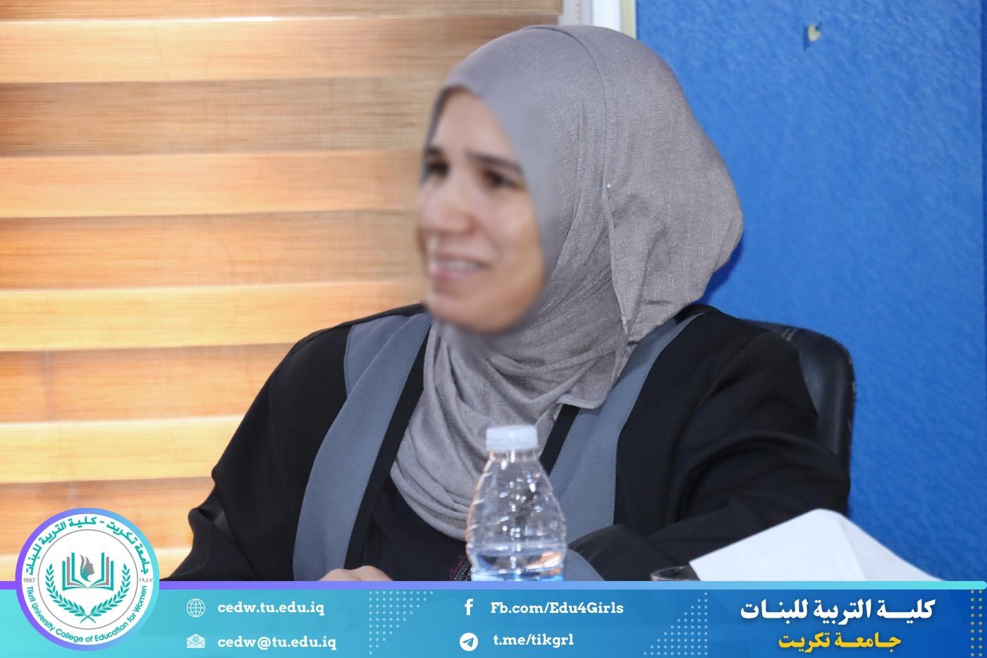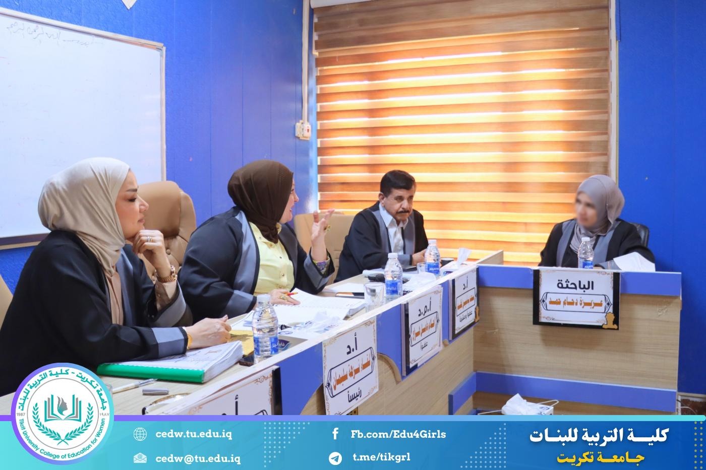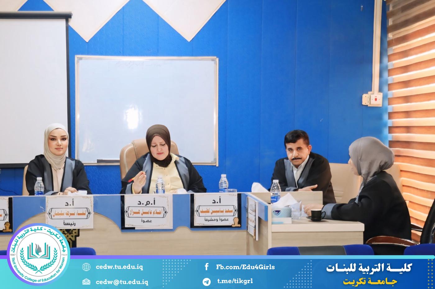 نوقشت في كلية التربية للبنات – قسم اللغة العربية، اليوم الخميس الموافق 28 / 8 / 2025، على قاعة السمنار في عمادة الكلية، رسالة الماجستير المقدمة من الطالبة عزيزة دحام حمد، والموسومة: