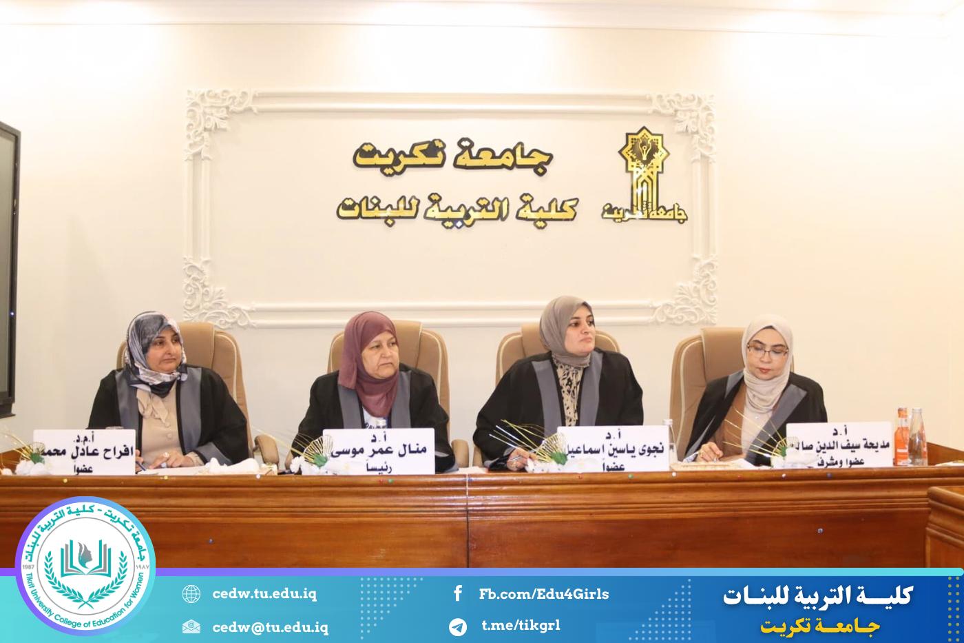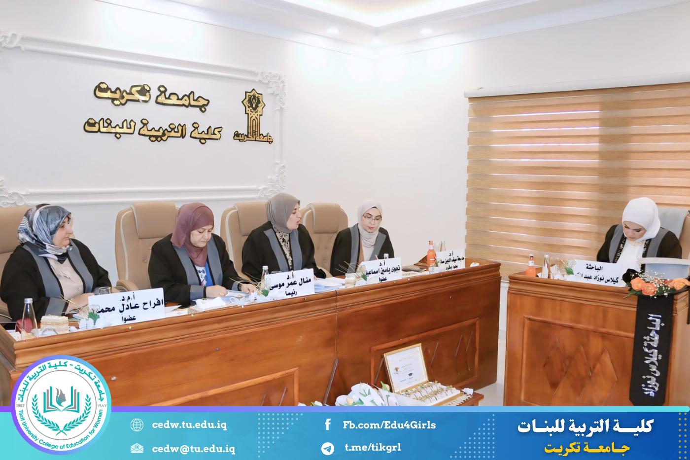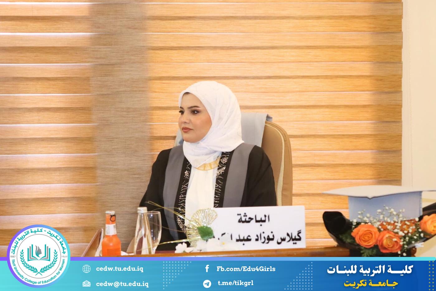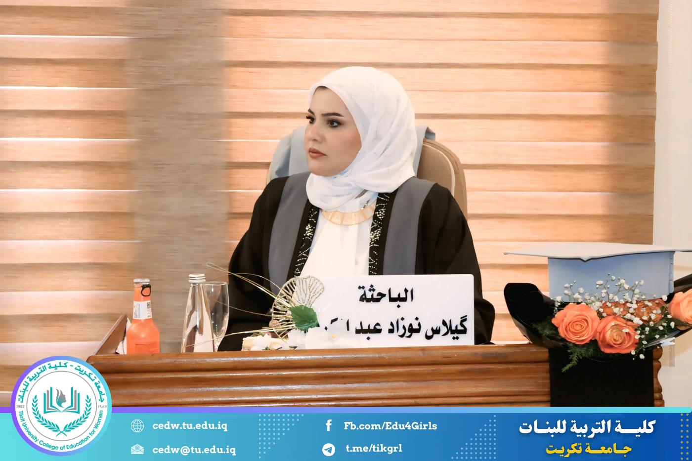 نوقشت في قسم اللغة الإنكليزية بكلية التربية للبنات – جامعة تكريت، صباح يوم الخميس الموافق ٢٨ آب ٢٠٢٥، مناقشة رسالة الماجستير المقدّمة من الطالبة (گيلاس نوزاد عبدالكريم)،