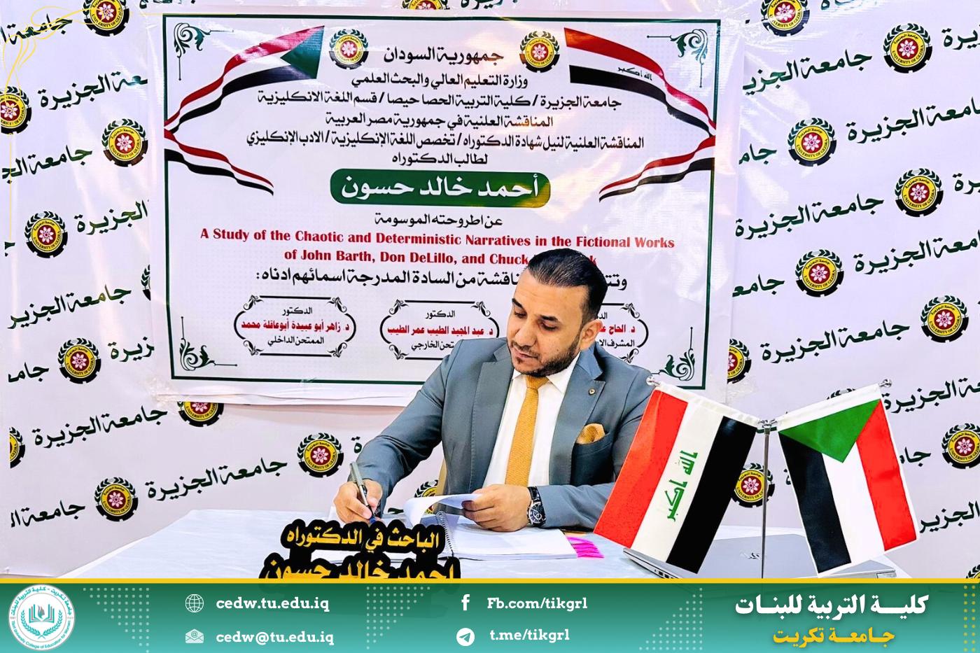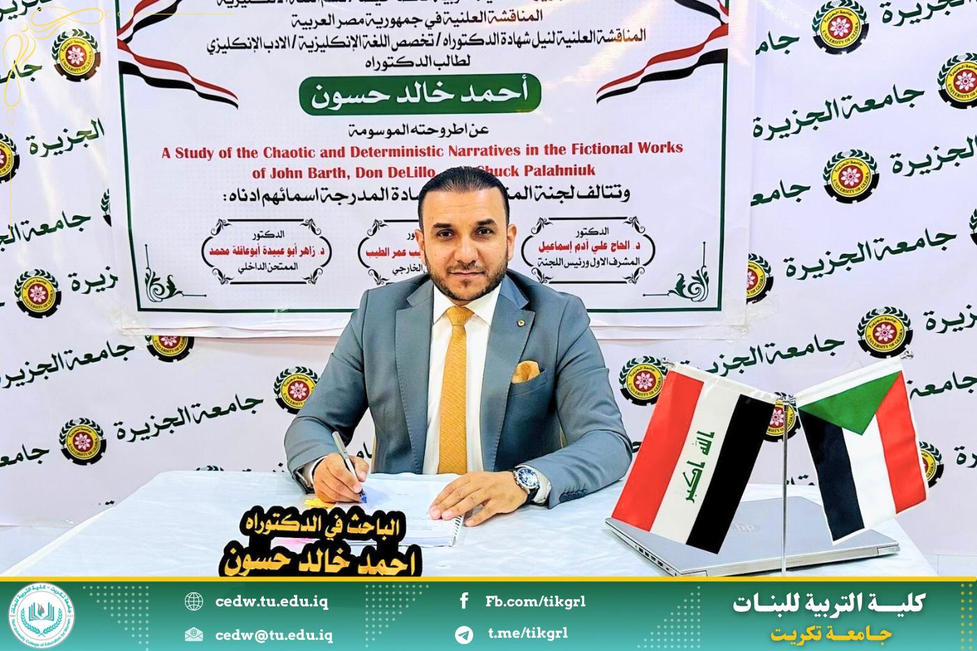 نال المدرس أحمد خالد حسون، التدريسي في كلية التربية للبنات / قسم اللغة الإنكليزية، شهادة الدكتوراه في تخصص الأدب الإنكليزي من جامعة الجزيرة في جمهورية مصر العربية، وذلك عن أطروحته الموسومة: