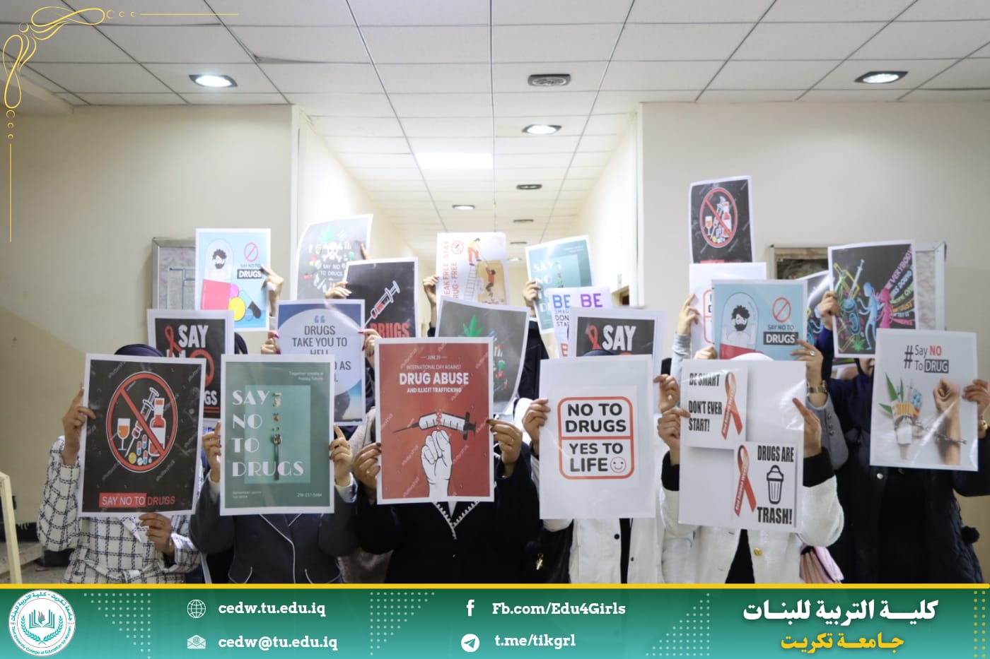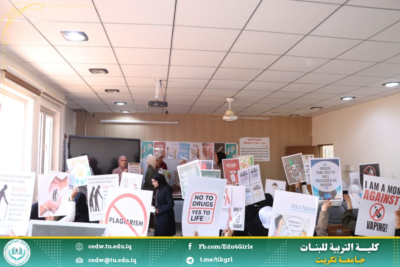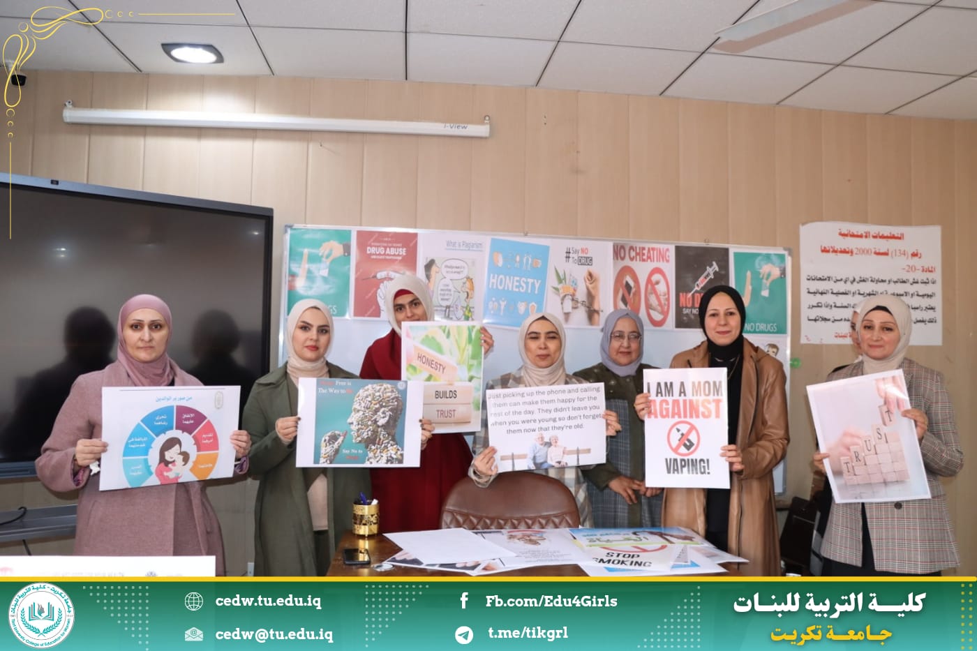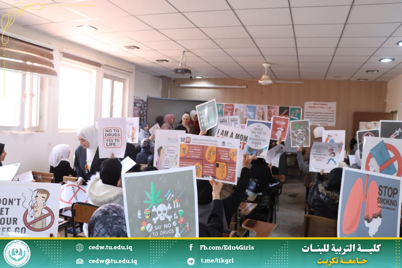 نظمت وحدة الإرشاد النفسي والتوجيه التربوي في كلية التربية للبنات بالتعاون مع قسم اللغة الإنكليزية مجموعة من النشاطات التوعوية وذلك بتوزيع بوسترات تخص بعض الظواهر السلبية في المجتمع كتعاطي المخدرات والتدخين والغش، كونها من الظواهر التي تلقي بتأثيراتها السلبية على سلامة المجتمع وتأتي هذه النشاطات التوعوية لحماية وتحصين طالباتنا من هذه الآفة الخطيرة، كما تم تسليط الضوء على بعض القضايا المهمة في المجتمع مثل بر الوالدين وموضوع الثقة والأمانة، وكان هنالك مشاركة للفيف من طالبات المرحلة الرابعة برفع هذه البوسترات في أروقة الكلية للتوعية بخطورة هذه الظواهر والعمل على الحد منها للحفاظ على سلامة مجتمعنا.