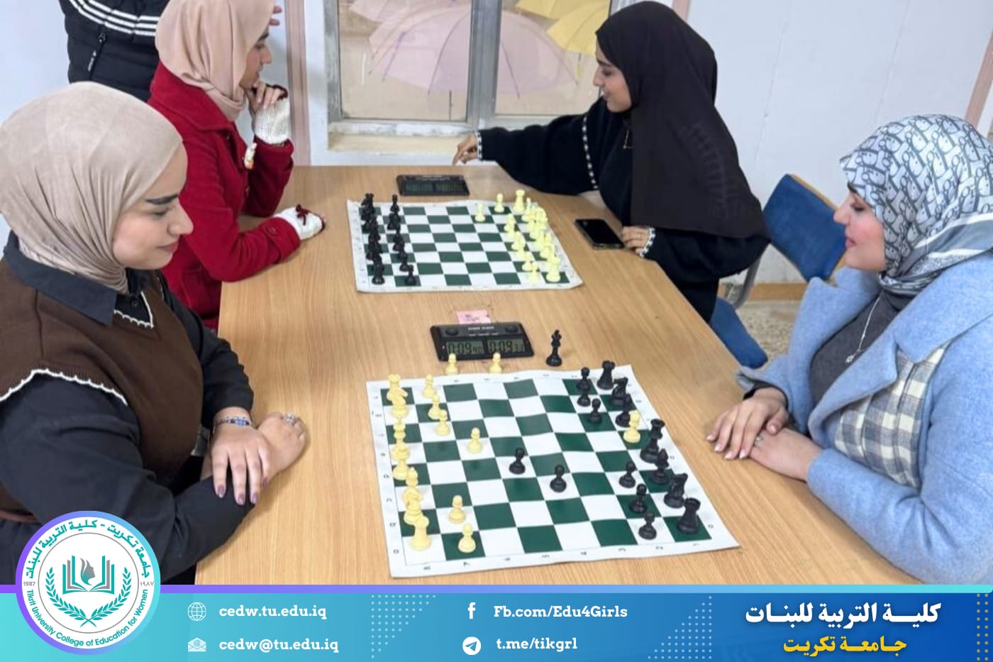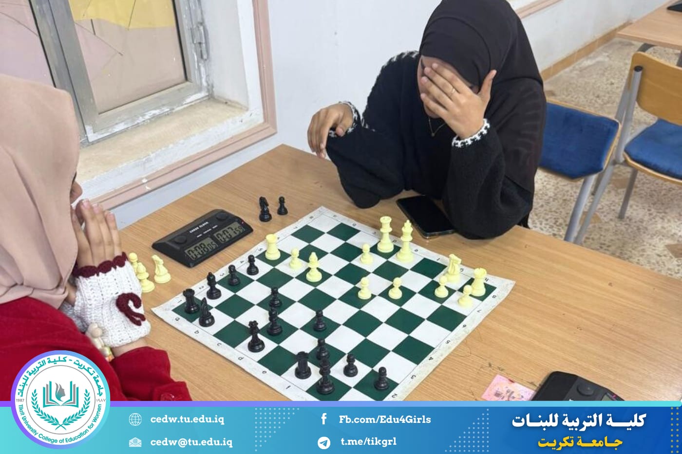 سجلت كلية التربية للبنات حضورها في بطولة الجامعة للشطرنج التي أقامها قسم النشاطات الطلابية، والتي احتضنتها كلية العلوم الإسلامية بالتعاون مع الأمانة العامة للمكتبة المركزية، ضمن إطار دعم الأنشطة الطلابية وتنمية المهارات العقلية.