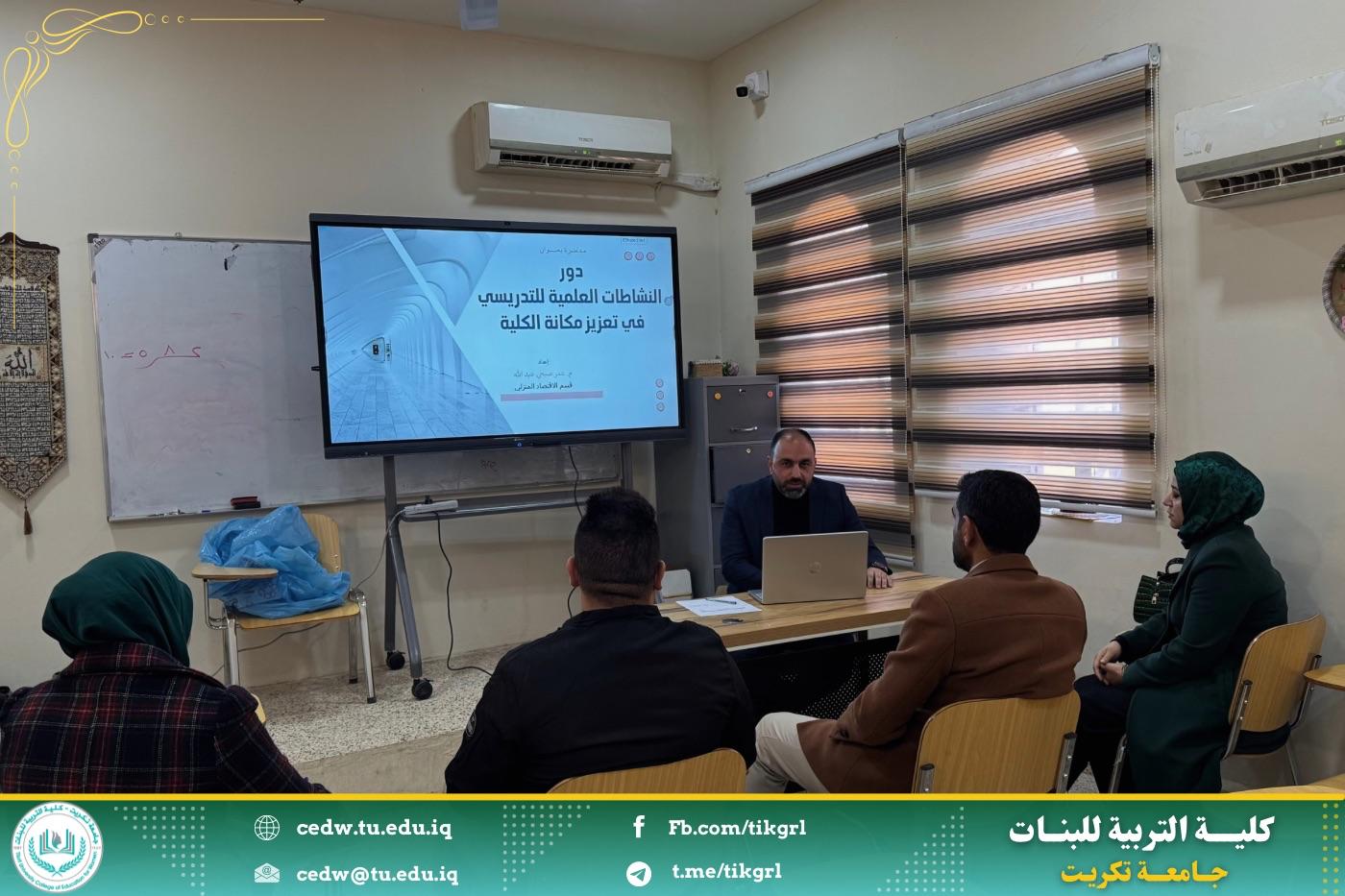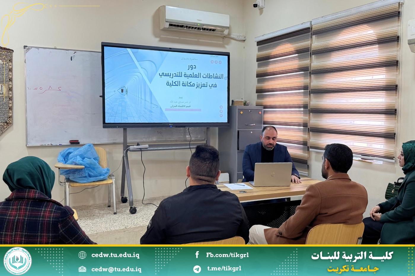 اقامت كلية التربية للبنات/ قسم الاقتصاد المنزلي بالتعاون مع قسم الشؤون العلمية ومركز التعليم المستمر، محاضرة بعنوان : النشاطات العلمية للتدريسي في تعزيز مكانة الكلية، وذلك اليوم الاثنين الموافق ١٠ / ٢ / ٢٠٢٥ على رحاب قاعة قسم الاقتصاد المنزلي