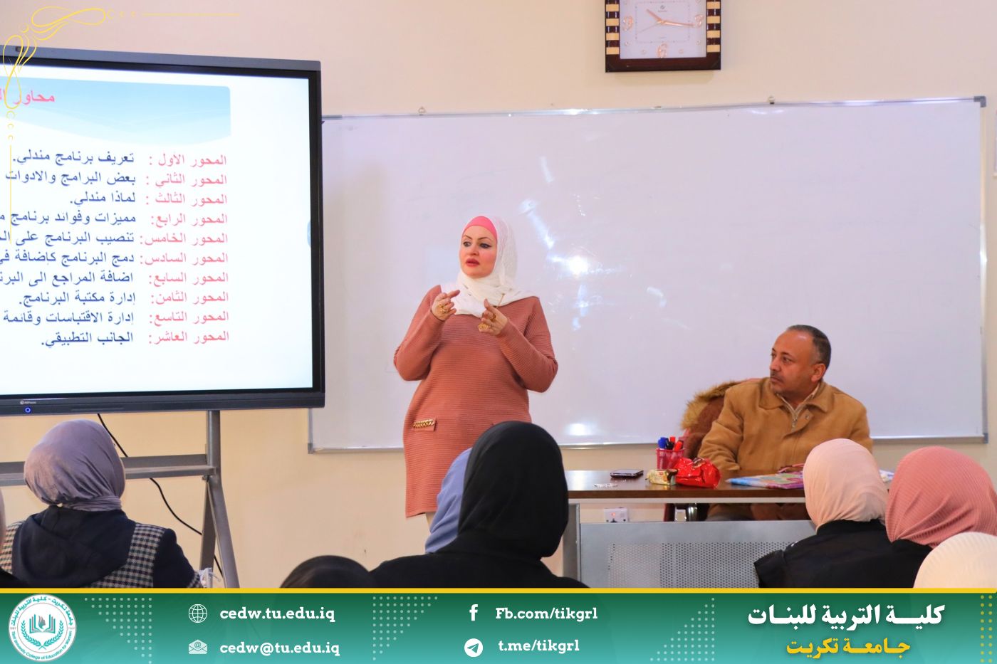 اقام مركز التعليم المستمر بالتعاون مع كلية التربية للبنات قسم الرياضيات دورة بعنوان : تطبيق مندلي في كتابة البحوث والأطاريح، وذلك ليومي الاثنين والثلاثاء الموافق ١٠ - ١١ / ٢ / ٢٠٢٥ على رحاب قاعة المرحلة الثالثة - قسم رياضيات