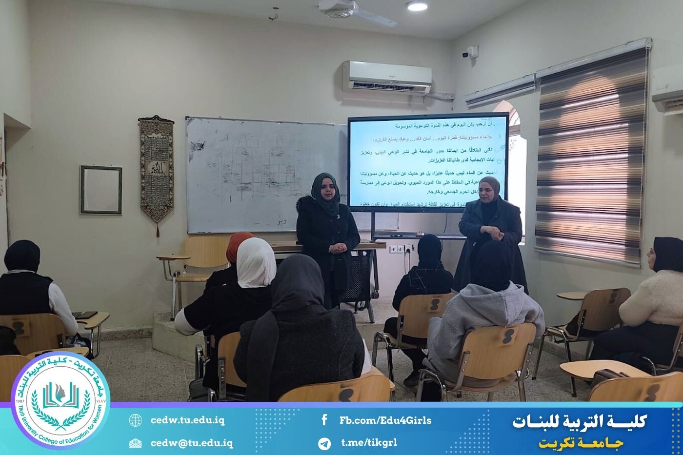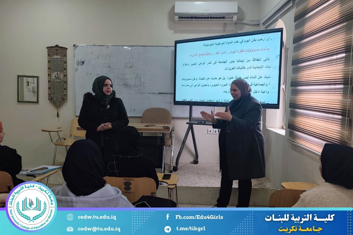 نظّمت وحدة الإرشاد النفسي والتوجيه التربوي، بالتعاون مع قسم الاقتصاد المنزلي في كلية التربية للبنات بجامعة تكريت، ندوة إرشادية بعنوان «الماء مسؤوليتنا… قطرة ماء أمان الغد»، وذلك يوم الأحد الموافق ٢٨ / ١٢ / ٢٠٢٥، على رحاب قاعة قسم الاقتصاد المنزلي، وبمشاركة عدد من التدريسيات والطالبات.