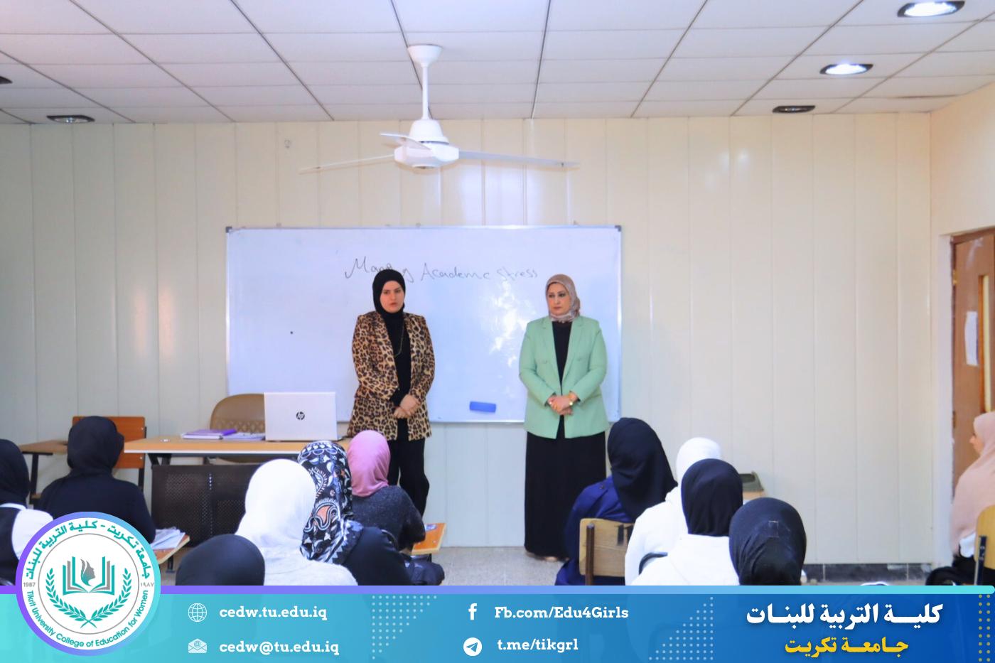 نظّم قسم اللغة الإنكليزية في كلية التربية للبنات – جامعة تكريت، وبالتعاون مع مركز التعليم المستمر في جامعة تكريت، دورةً علميةً بعنوان: «Managing Academic Stress: Strategies for Success»، وذلك على مدى يومي الثلاثاء والأربعاء الموافقين 10–11 / 3 / 2026، وعلى رحاب قاعات قسم اللغة الإنكليزية، بمشاركة عدد من طالبات القسم.
