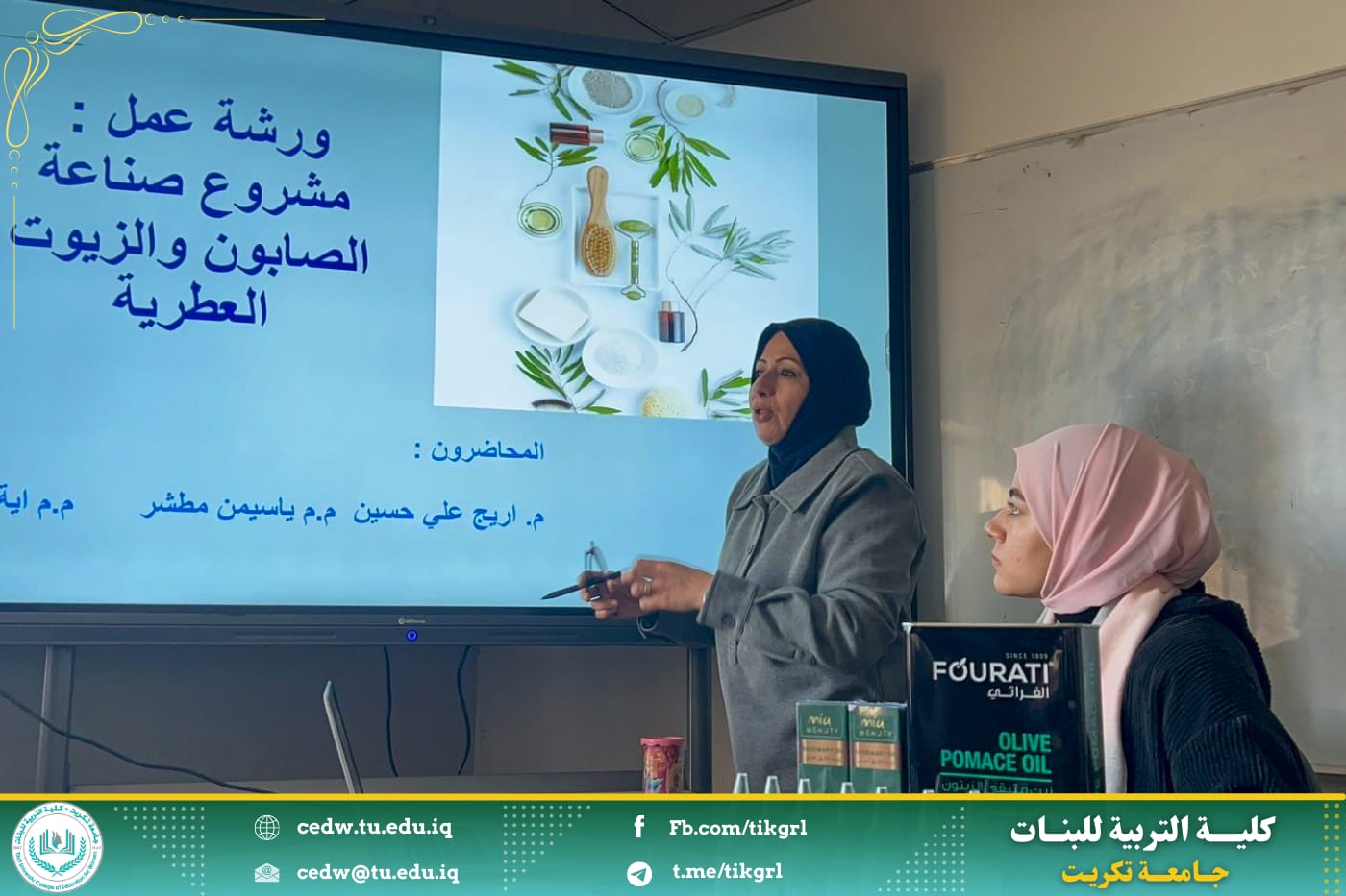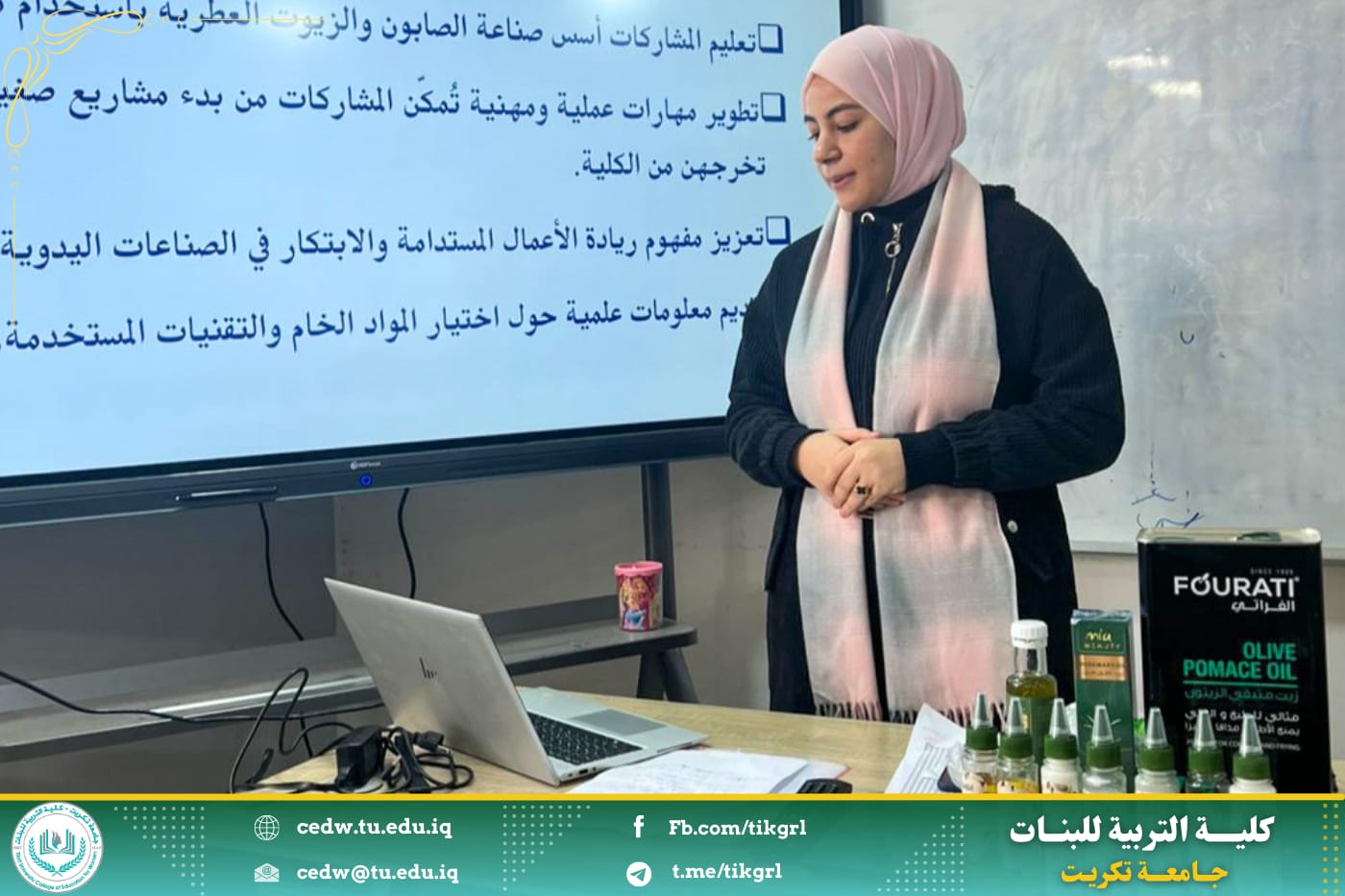 بدأت دورة اليوم الاول في قسم الكيمياء عن كيفية صناعة الصابون الطبيعي والزيوت العطرية الصديقة للبيئة حيث تضمنت جانب نظري وافي وخطة العمل ومن ثم التطبيق المباشر في المختبر