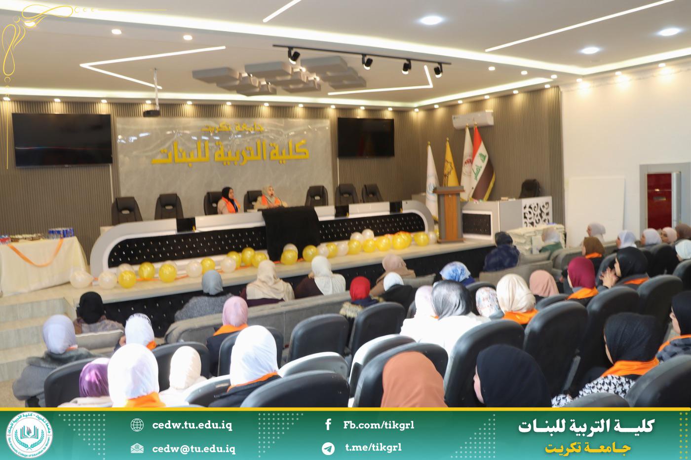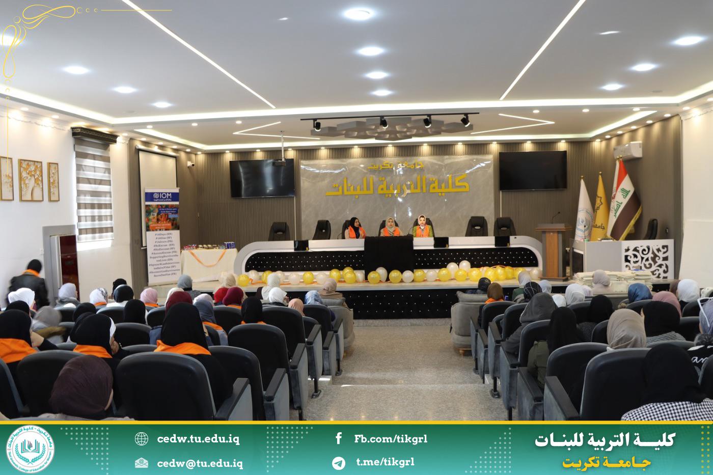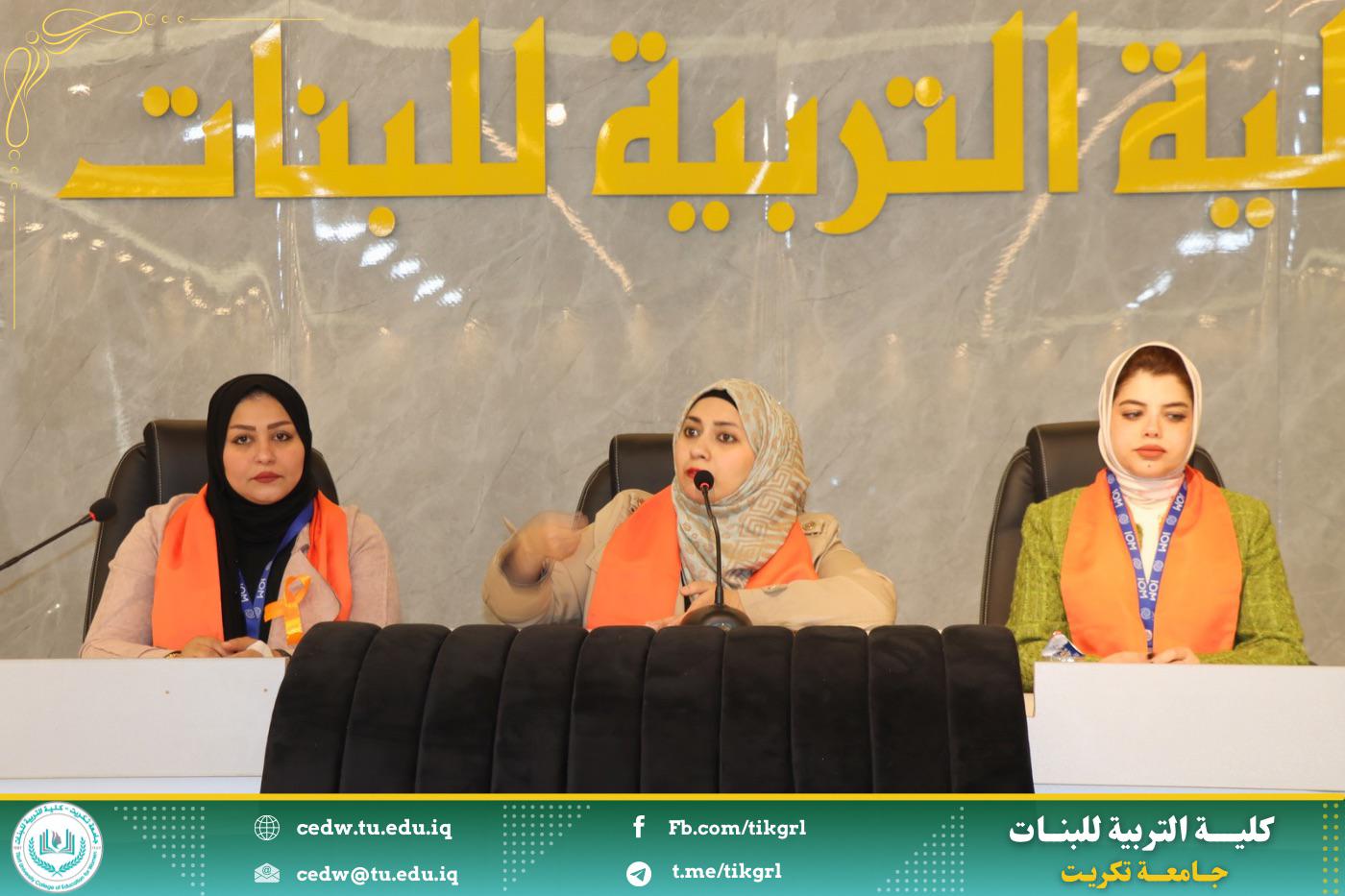 برعاية الأستاذ الدكتور وعد محمود رؤوف المحترم رئيس جامعة تكريت وبإشراف الأستاذ الدكتورة نجلاء عبدالحسين عليوي المحترمة عميد كلية التربية للبنات اقامت كلية التربية للبنات وحدة شؤون المرأة بالتعاون مع وكالة الامم المتحدة للهجرة ورشه عمل بعنوان : (العنف ضد المرأة واثره في هدم المجتمع) تحت شعار: كل يد تؤذي يجب ان توقف