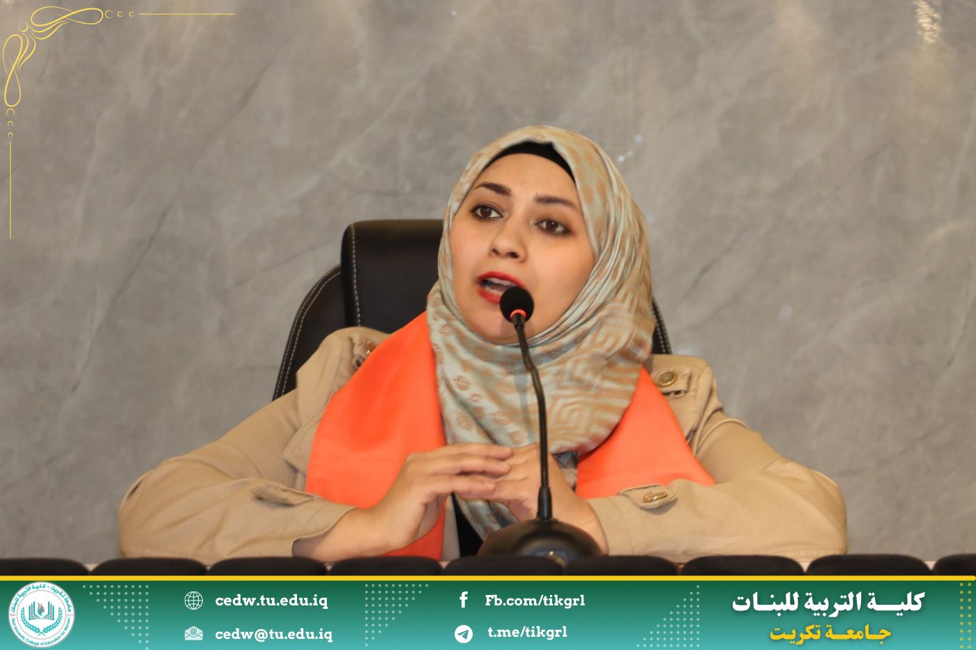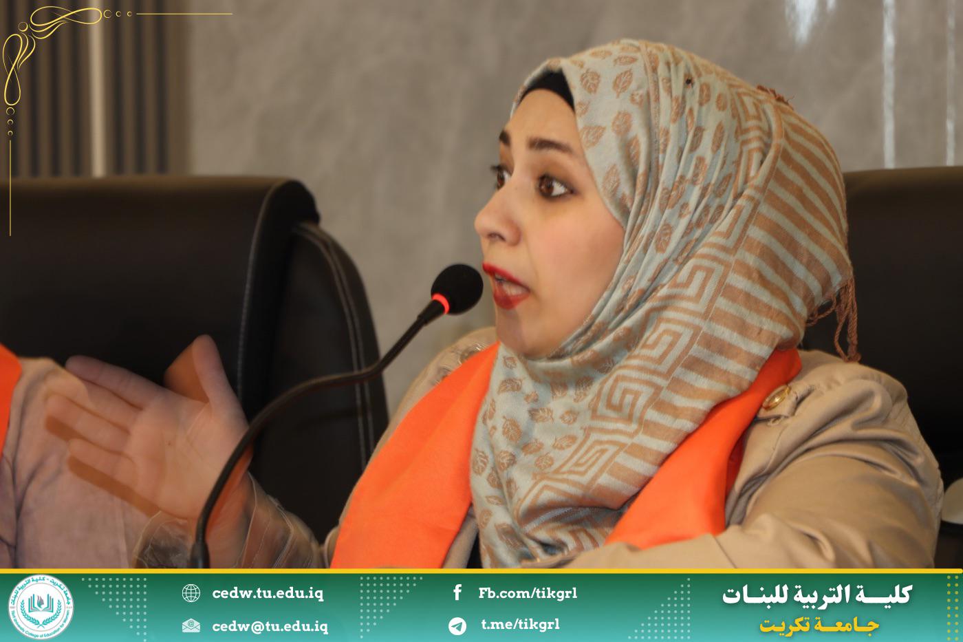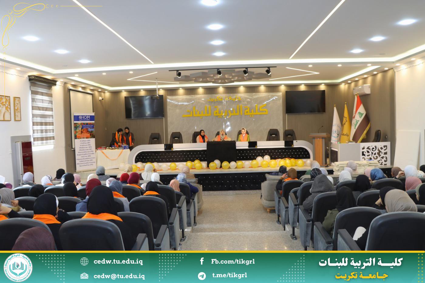 برعاية الأستاذ الدكتور وعد محمود رؤوف المحترم رئيس جامعة تكريت وبإشراف الأستاذ الدكتورة نجلاء عبدالحسين عليوي المحترمة عميد كلية التربية للبنات اقامت كلية التربية للبنات وحدة شؤون المرأة بالتعاون مع وكالة الامم المتحدة للهجرة ورشه عمل بعنوان : (العنف ضد المرأة واثره في هدم المجتمع) تحت شعار: كل يد تؤذي يجب ان توقف
