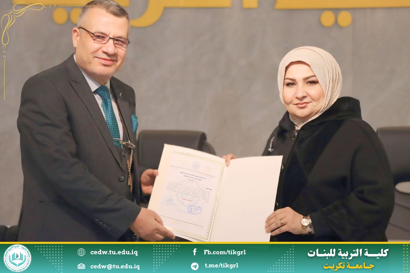 وبأسم كلية التربية للبنات تم منح الاستاذ الدكتور صالح حسين عبدالله شهادة شكر وتقدير على ماقدمه من عرض مميز ورائع للمعلومات التي تخدم الطالبات الجدد المقبلين على الحياة الجامعية وجميع العاملين في المؤسسات الأكاديمية.