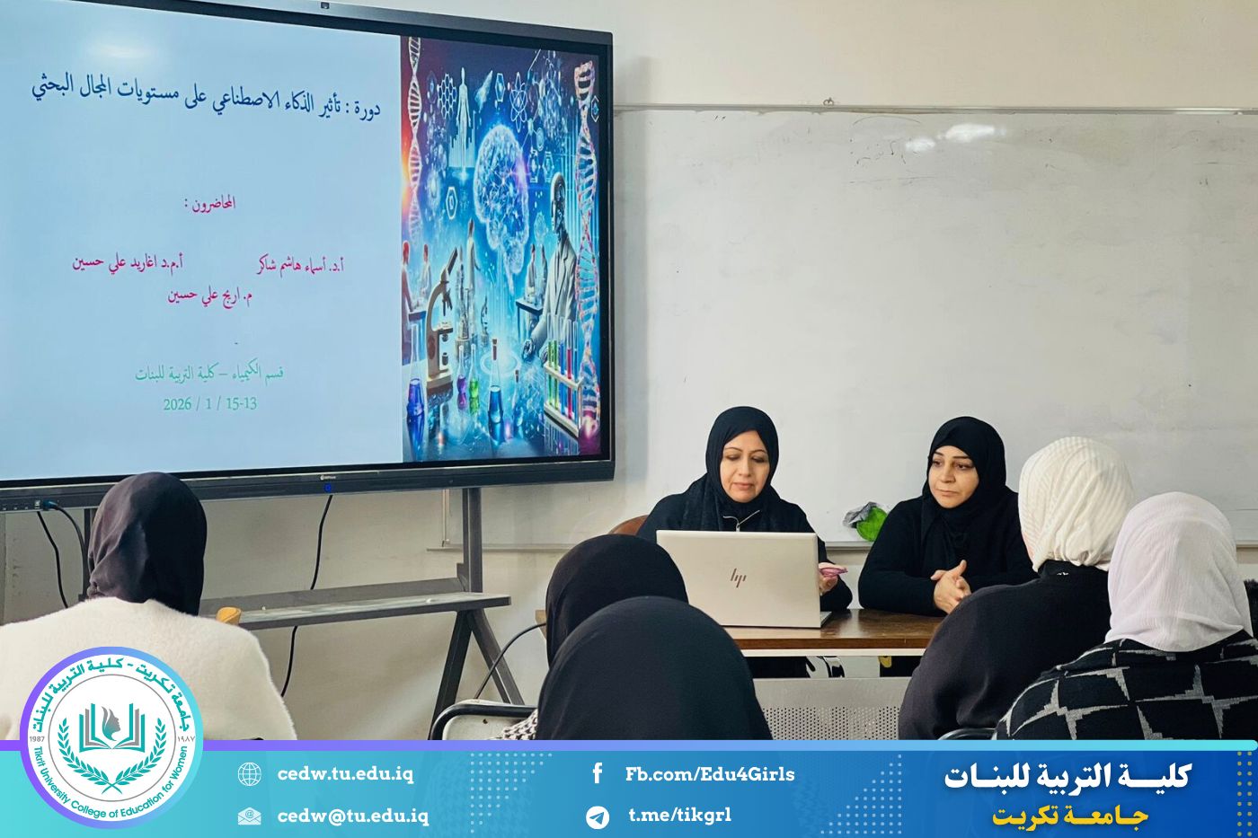 أقامت كلية التربية للبنات - قسم الكيمياء، وبالتعاون مع مركز التعليم المستمر، دورة علمية بعنوان (تأثير الذكاء الاصطناعي على مستويات المجال البحثي)، وذلك للأيام الثلاثاء والأربعاء والخميس الموافق 13–14–15 / 1 / 2026، وعلى قاعة المرحلة الرابعة - قسم الكيمياء في بناية الأقسام العلمية