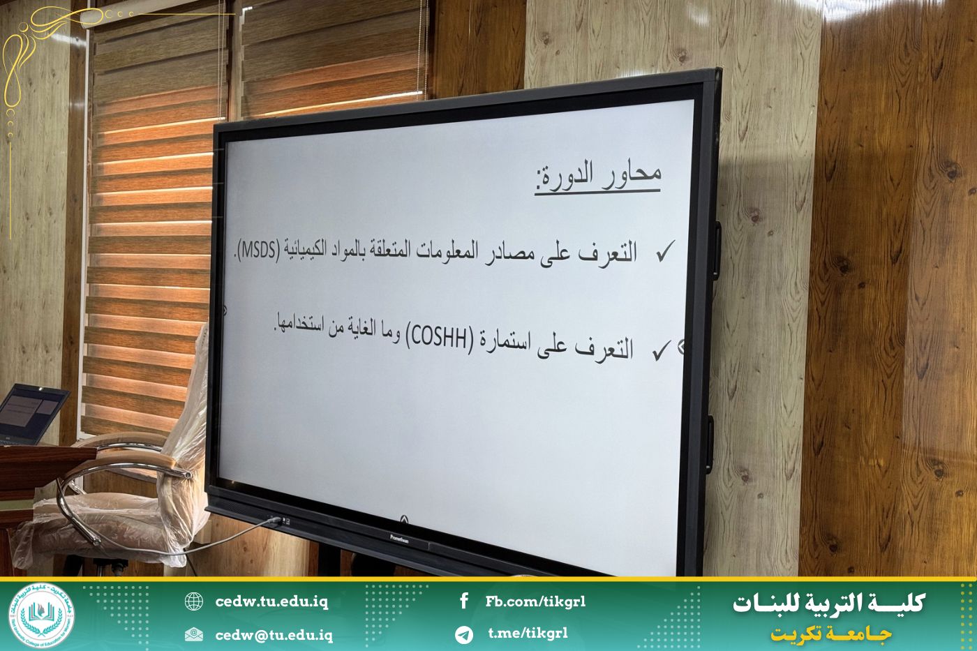 اقام مركز التعليم المستمر بالتعاون مع كلية التربية للبنات دورة تدريبية تعليمية بعنوان : التعامل الآمن مختبرياً مع المواد الكيمياوية، وذلك ليومي الثلاثاء والأربعاء الموافق ١٨ - ١٩ / ٢ / ٢٠٢٥ على رحاب قاعة السمنار - بناية الأقسام العلمية