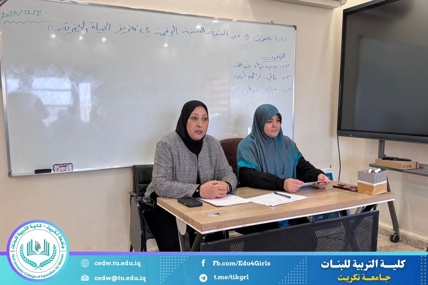 نظّم قسم الجغرافية في كلية التربية للبنات، بالتعاون مع مركز التعليم المستمر، دورة علمية بعنوان «دور البنية التحتية الرقمية في تعزيز الحياة الحضرية»، وذلك على مدى يومي الأحد والاثنين الموافقين ٢١–٢٢ / ١٢ / ٢٠٢٥، وعلى رحاب قاعة المرحلة الثالثة في قسم الجغرافية.