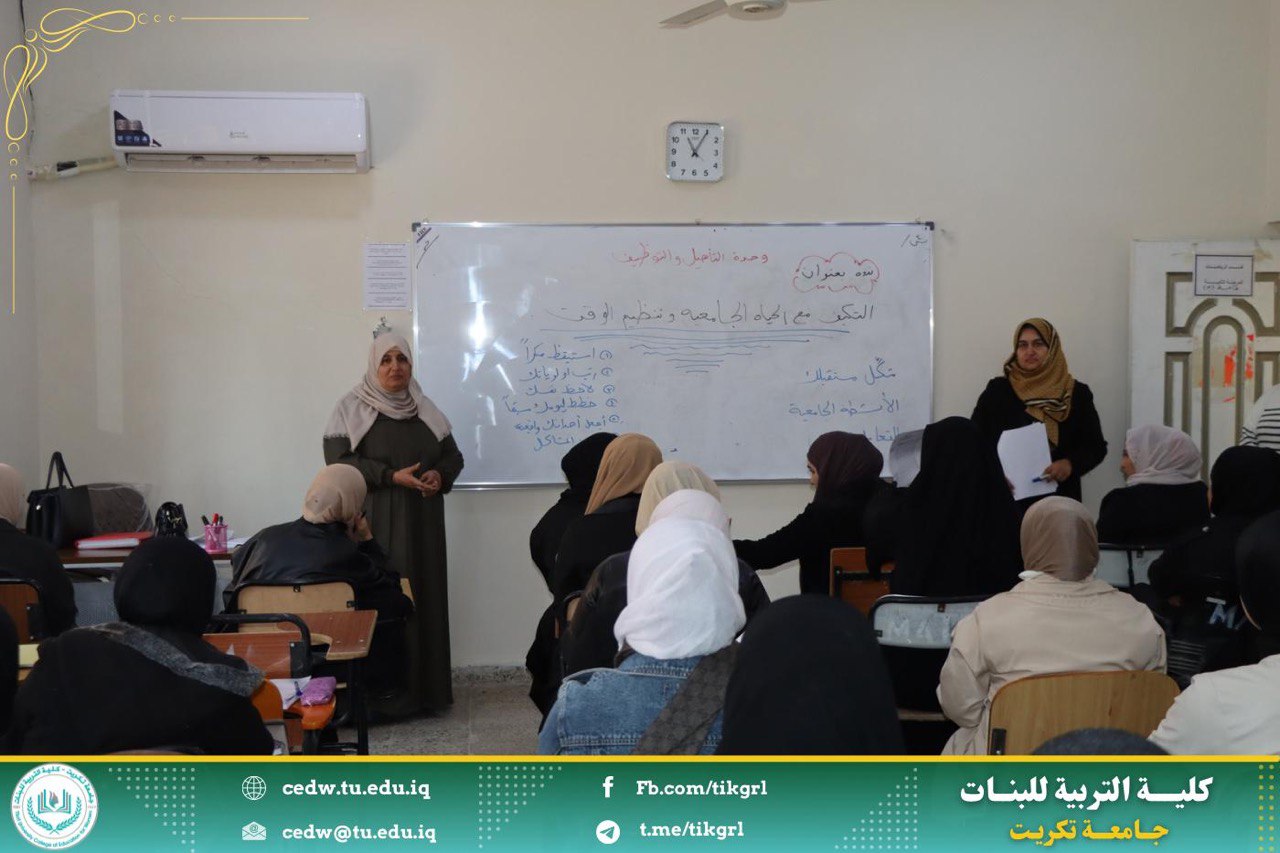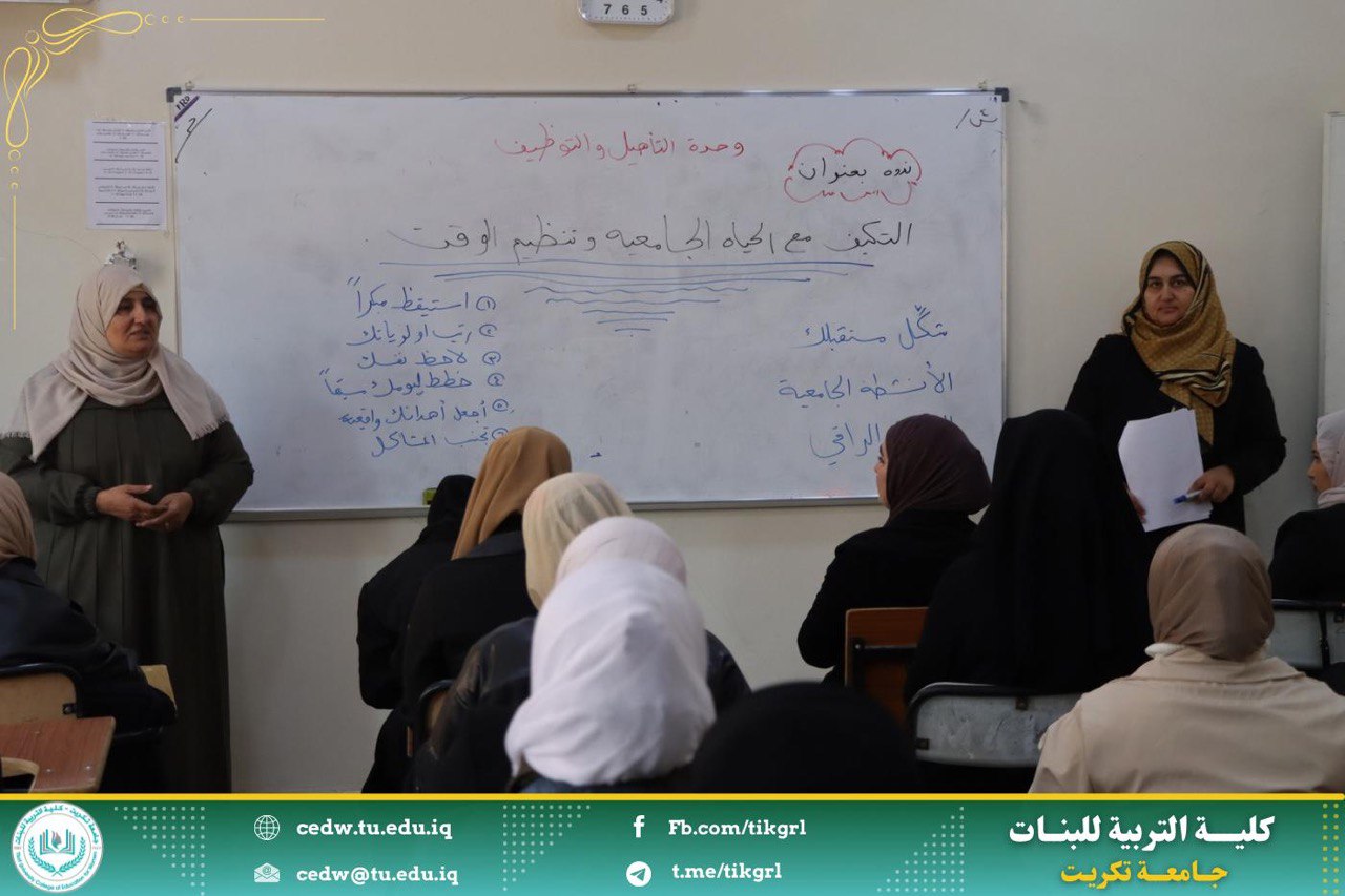 أقامت وحدة التأهيل والتوظيف والمتابعة بالتعاون مع كلية التربية للبنات قسم الرياضيات ندوة عنوانها التكييف مع الحياة الجامعية وتنظيم الوقت ، ذلك يوم الثلاثاء الموافق ٣ / ١٢ / ٢٠٢٤ ، على رحاب قاعة المرحلة الرابعة قسم الرياضيات