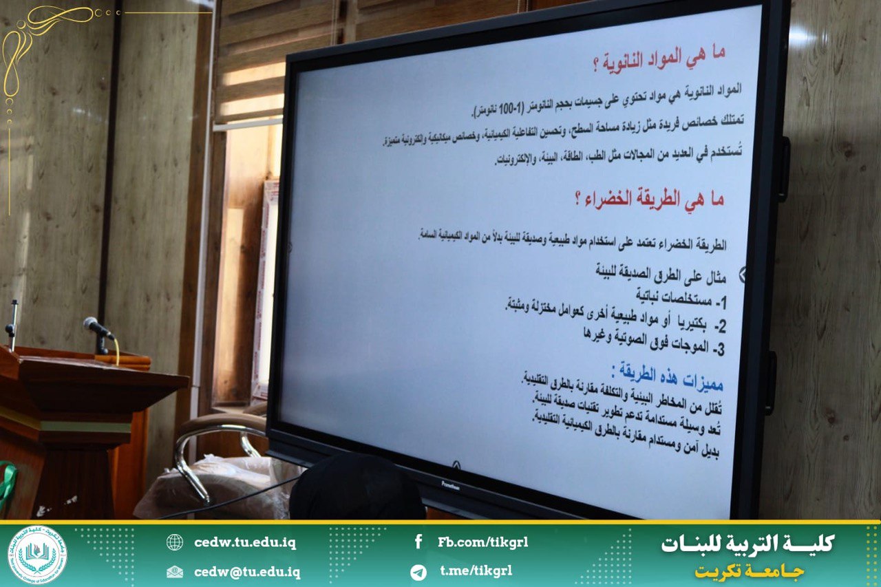 برعاية الأستاذ الدكتور وعد محمود رؤوف رئيس جامعة تكريت وبإشراف الأستاذ الدكتورة نجلاء عبدالحسين عليوي عميد كلية التربية للبنات والاستاذ المساعد الدكتور سياف عبد حسين مدير مركز التعليم المستمر وبالتعاون مع كلية التربية للبنات أقام مركز التعليم المستمر بالتعاون مع كلية التربية للبنات دورة تدريبية بعنوان: ( تحضيرات ودراسة تطبيقات المواد النانوية بالطريقة الخضراء الصديقة للبيئة) في يوم الثلاثاء والاربعاء الموافق 17-18/ 12/ 2024 على قاعة السمنار في بناية الأقسام العلمية