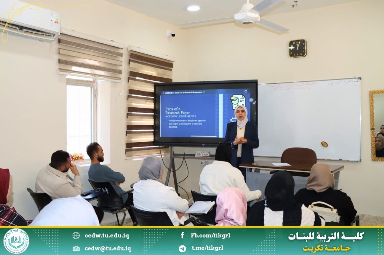 أقامت كلية التربية للبنات قسم اللغة الإنكليزية ورشة عمل بعنوان: (Parts of a Research Paper) في يوم الاثنين الموافق 23/ 12/ 2024 على قاعة قسم اللغة الإنكليزية