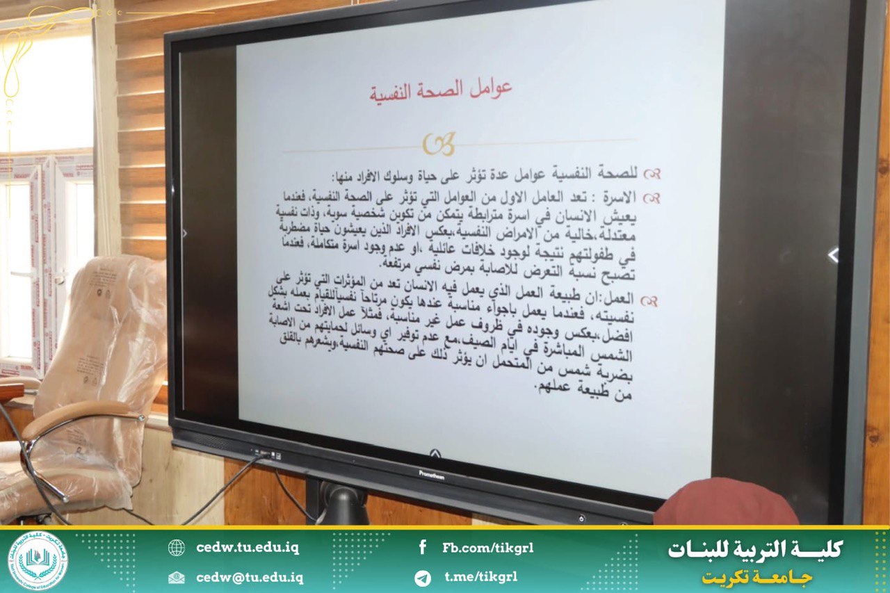 برعاية الأستاذ الدكتور وعد محمود رؤوف المحترم رئيس جامعة تكريت وبإشراف الأستاذ الدكتورة نجلاء عبدالحسين عليوي المحترمة عميد كلية التربية للبنات اقامت وحدة الارشاد النفسي والتوجيه التربوي بالتعاون مع قسم علوم الحياة ندوة علمية بعنوان: (الصحة النفسية ودورها في تعزيز الثقة بالنفس والسلوك الايجابي لدى طالبات الجامعة ) في يوم الاثنين الموافق 9/ 12/ 2024 على قاعة السمنار في بناية الاقسام العلمية