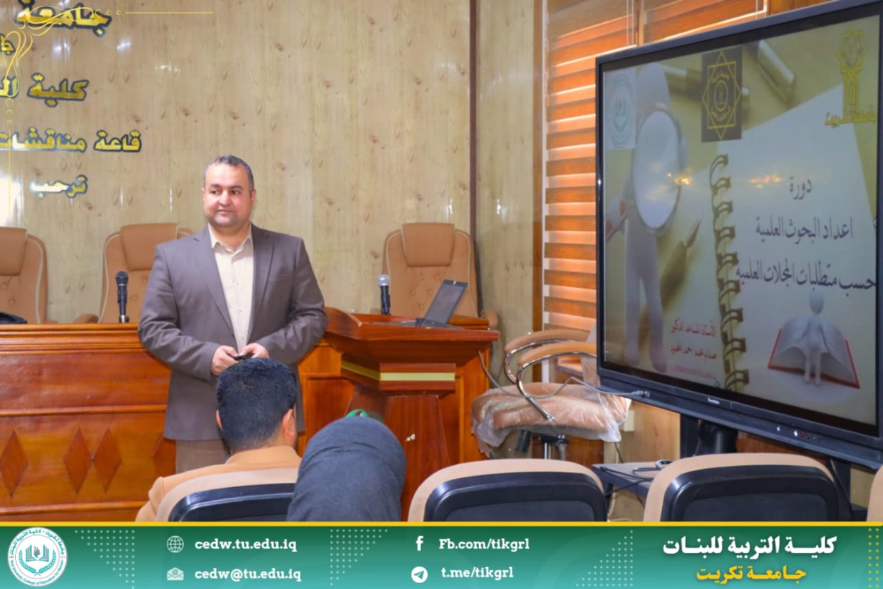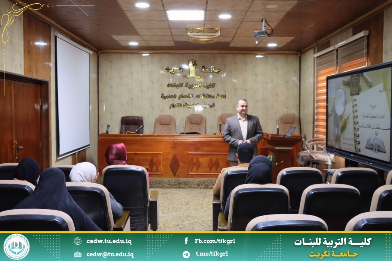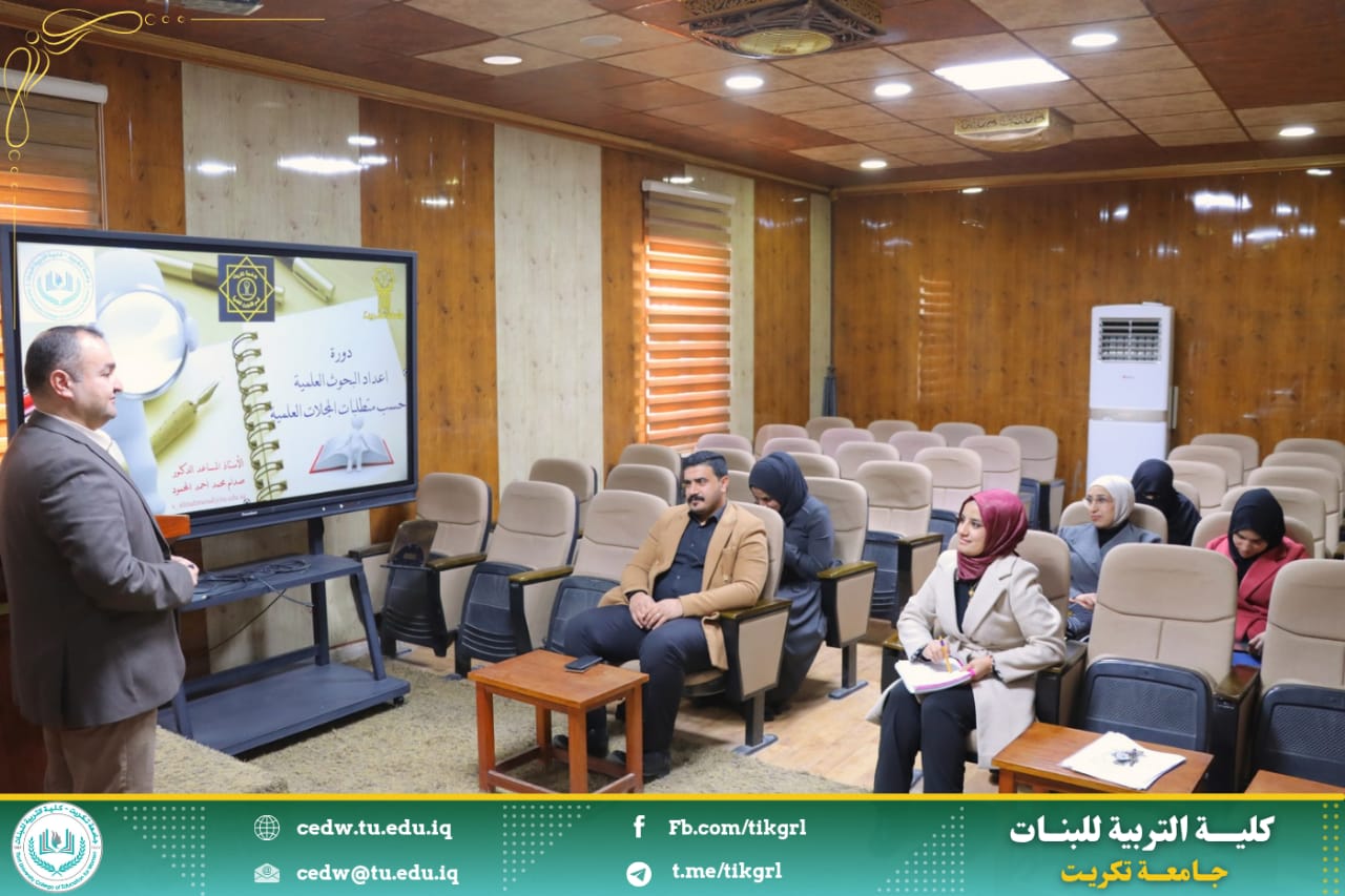 اقامت كلية التربية للبنات بالتعاون مع قسم الشؤون العلمية ومركز التعليم المستمر دورة بعنوان : إعداد البحوث العلمية حسب متطلبات المجلات العلمية ، وذلك للأيام الاثنين والثلاثاء والأربعاء الموافق ١٧ - ١٨ - ١٩ / ٢ / ٢٠٢٥ على رحاب قاعة السمنار - بناية الأقسام العلمية