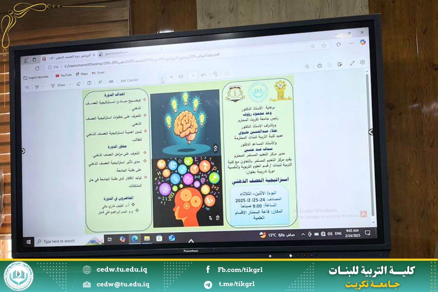 أقام مركز التعليم المستمر بالتعاون مع كلية التربية للبنات قسم العلوم التربوية والنفسية دورة تدريبية بعنوان: ( استراتيجية العصف الذهني ) في يومي الاثنين والثلاثاء الموافق 24-25/ 2/ 2025 على قاعة السمنار في بناية الأقسام العلمية