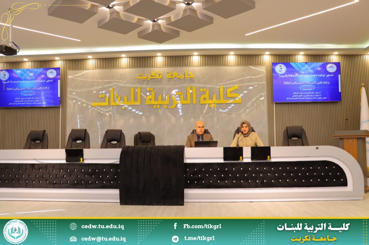 اقامت كلية التربية للبنات بالتعاون مع شعبة ضمان الجودة والأداء الجامعي ورشة بعنوان : معايير المجلس الوطني لاعتماد برنامج كليات المجموعة التربوية، وذلك اليوم الثلاثاء الموافق ٤ / ٢ / ٢٠٢٥ على رحاب قاعة المرحوم الأستاذ الدكتور جايد زيدان