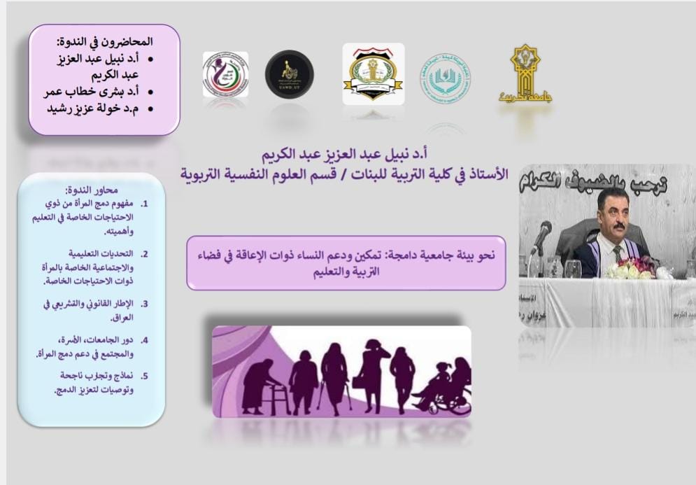 أقامت كلية التربية للبنات بالتعاون مع مركز التعليم المستمر ووحدة شؤون المرأة ذات الإعاقة في جامعة تكريت ، ندوة علمية موسومة: