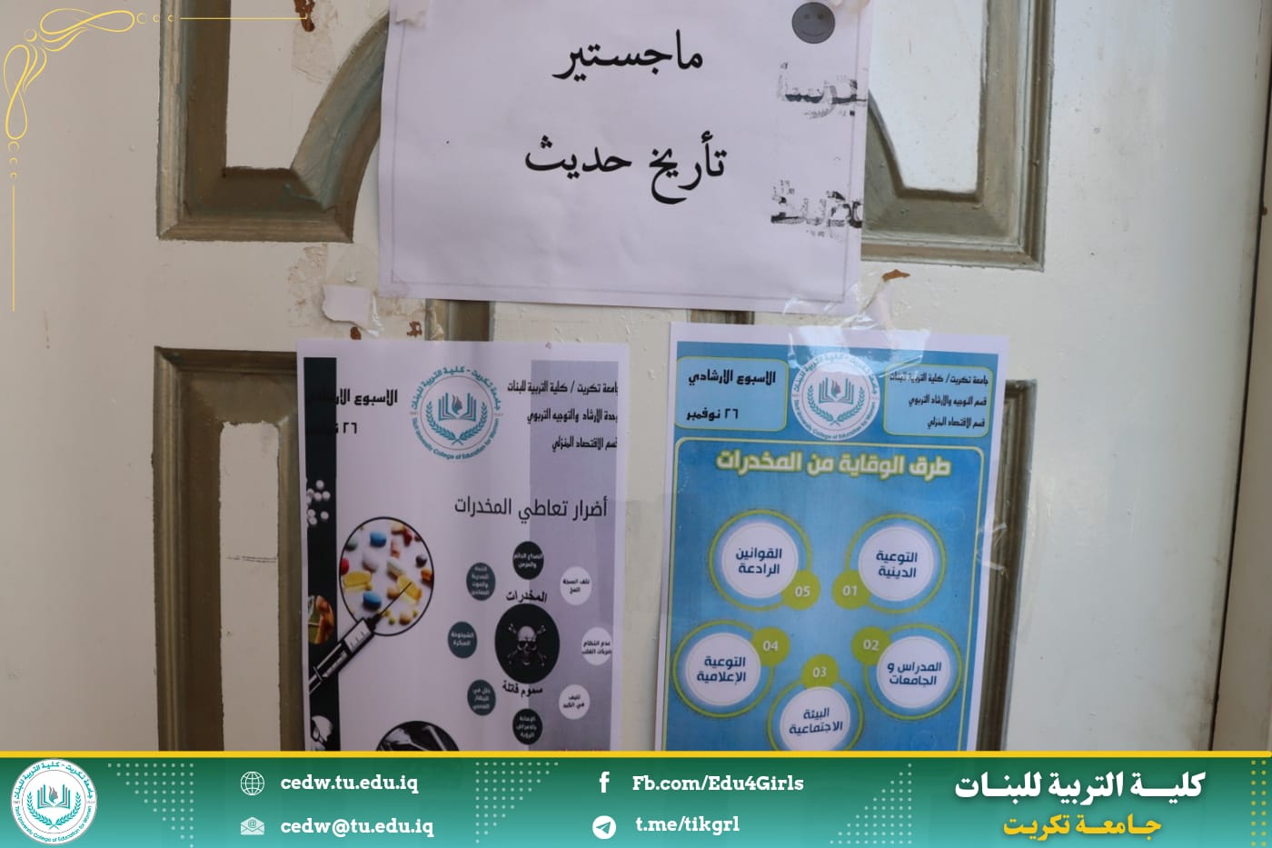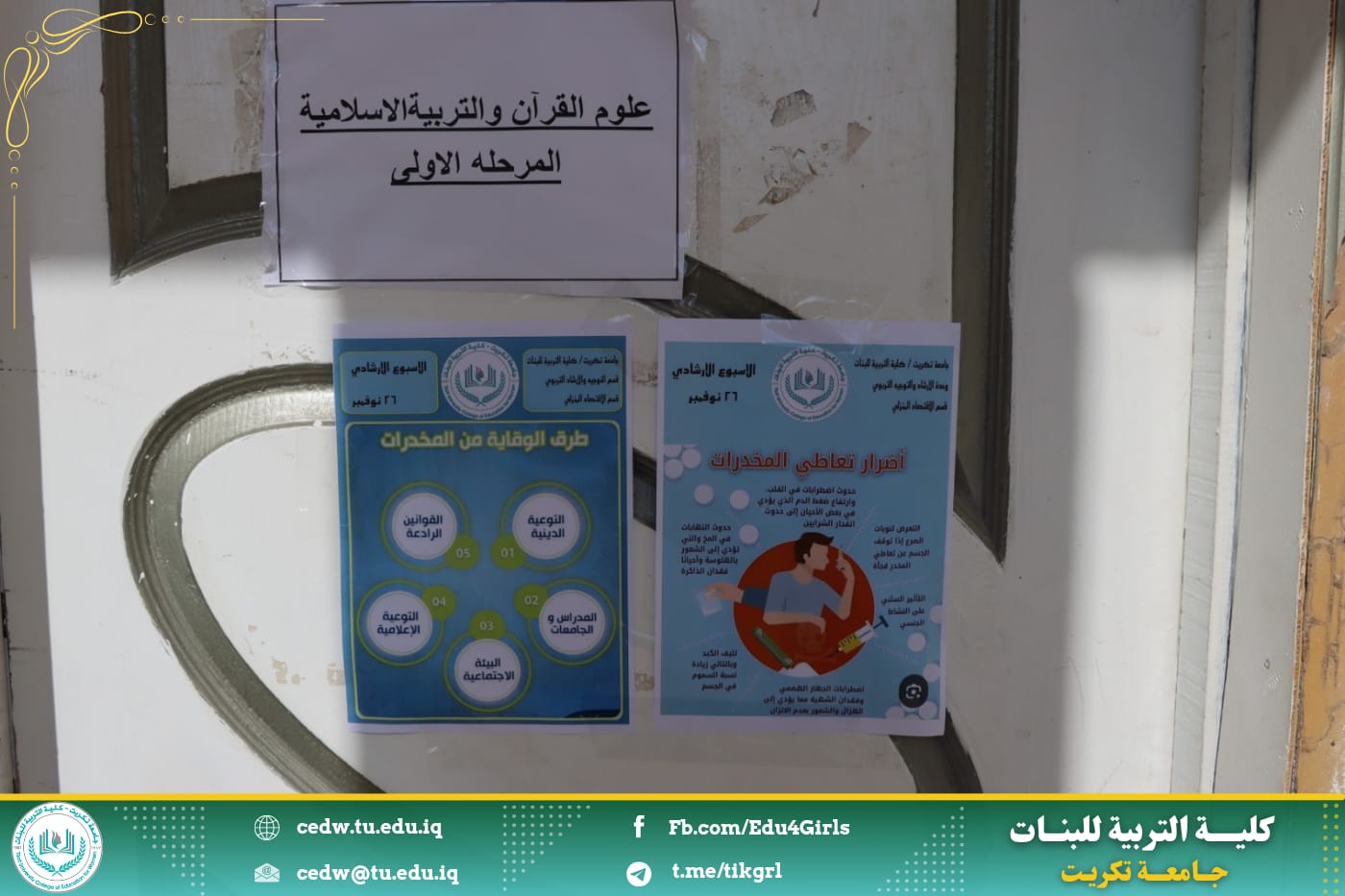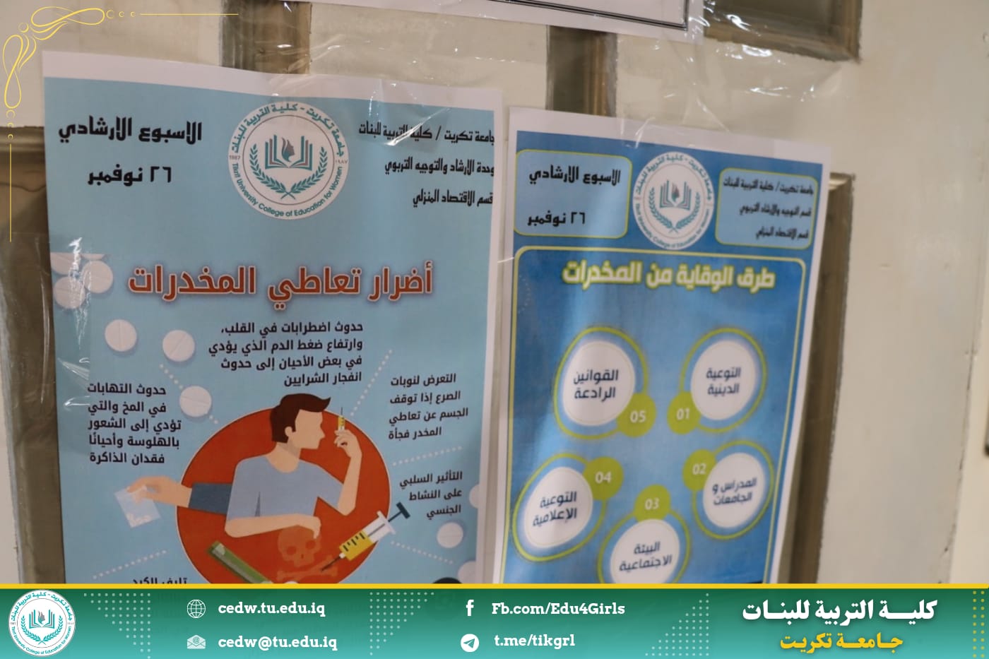 نظمت وحدة الإرشاد النفسي والتوجيه التربوي في كلية التربية للبنات بالتعاون مع قسم الاقتصاد المنزلي حملة ضد المخدرات من خلال عمل بوسترات توعوية عن المخدرات وتعليقها على أروقة الكلية، وهدفت الحملة إلى بيان أهمية الموضوع والخطورة التي تنطوي عليها الظاهرة والتي تشكل تهديداً حقيقياً للمجتمع كونها تستهدف أهم عنصر فيه وهم فئة الشباب الذين يمثلون الدعامة الأساسية التي يقوم ويرتكز عليها، مما ينعكس سلبًا على النواحي المختلفة بالتنمية الاجتماعية والاقتصادية التي ينشدها المجتمع ، وشاركت طالبات قسم الاقتصاد المنزلي في هذه الحملة من خلال رفع البوسترات داخل قاعاتهم الدراسية للتعبير عن مساهمتهم ودعمهم لمثل هذه الحملات التوعوية.