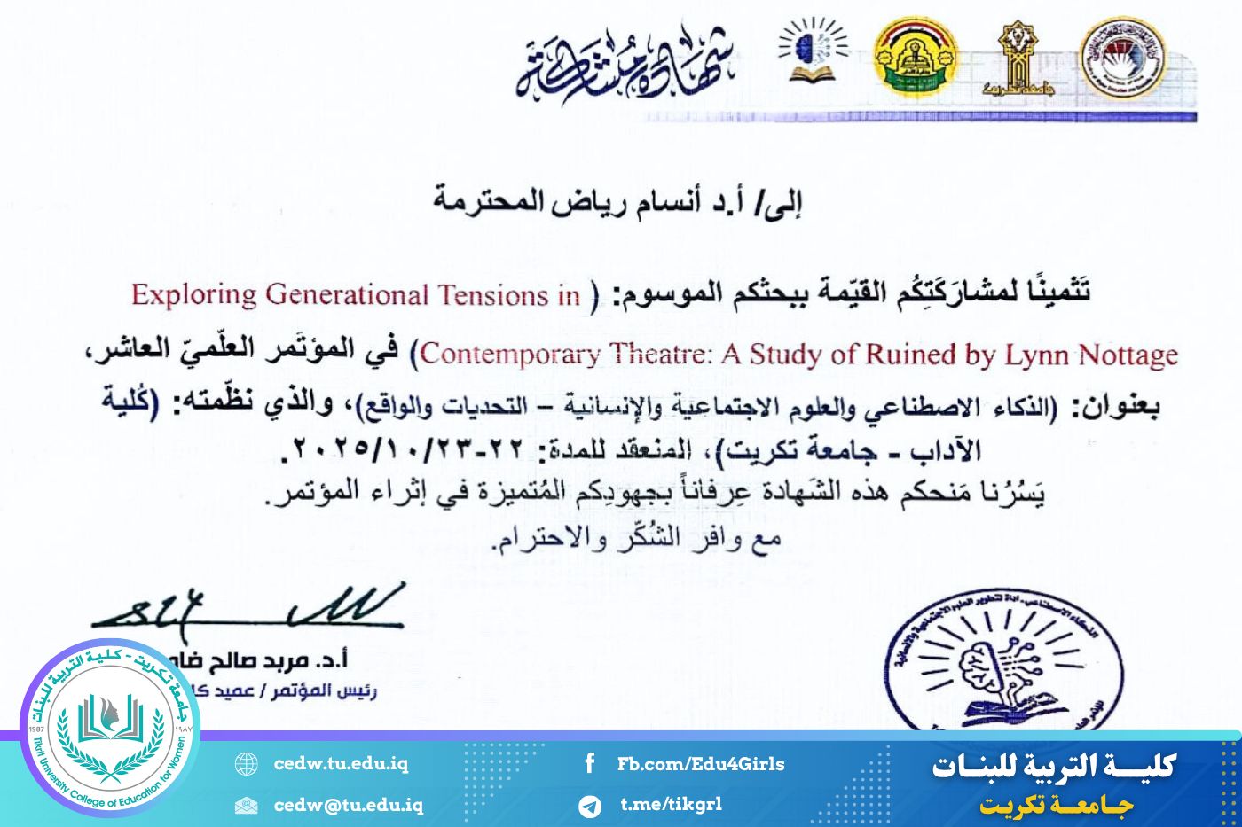 ويأتي هذا الإنجاز في إطار حرص كلية التربية للبنات – جامعة تكريت على دعم البحث العلمي وتشجيع التدريسيين على الانفتاح على مجالات المعرفة الحديثة والمشاركة الفاعلة في المؤتمرات العلمية المحلية والدولية بما يسهم في الارتقاء بالواقع الأكاديمي والبحثي للجامعة.