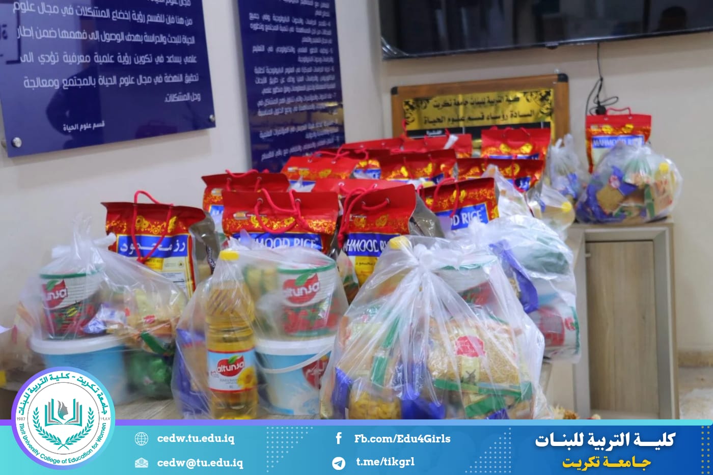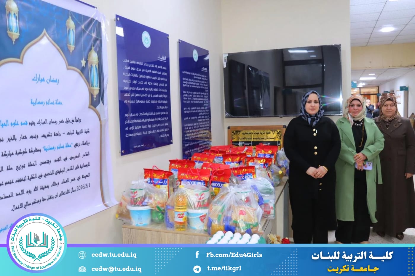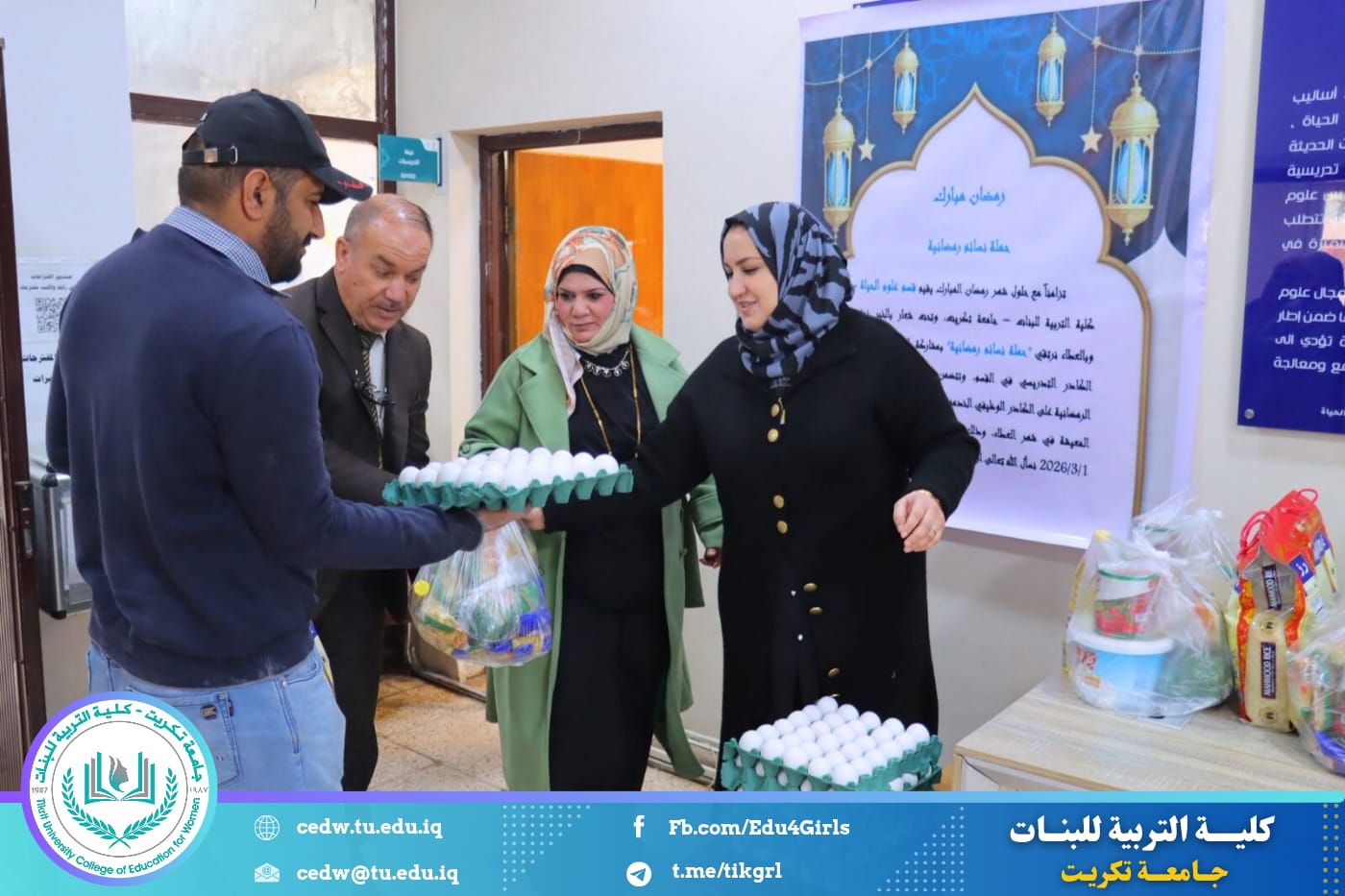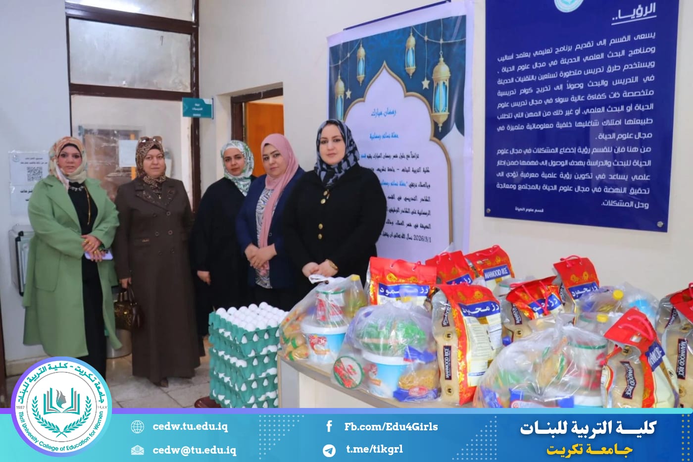 تزامناً مع حلول شهر رمضان المبارك، أقام قسم علوم الحياة في كلية التربية للبنات – جامعة تكريت حملة رمضانية نسوية تحت شعار (بالخير نجتمع وبالعطاء نرتقي)، بمشاركة كوكبة من الكادر التدريسي في القسم، وذلك في إطار تعزيز قيم التكافل الاجتماعي وترسيخ روح التعاون والعطاء خلال هذا الشهر الفضيل.