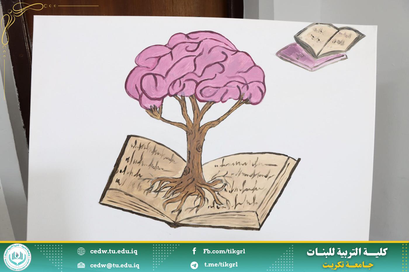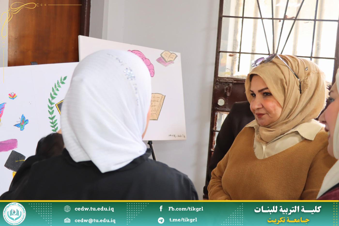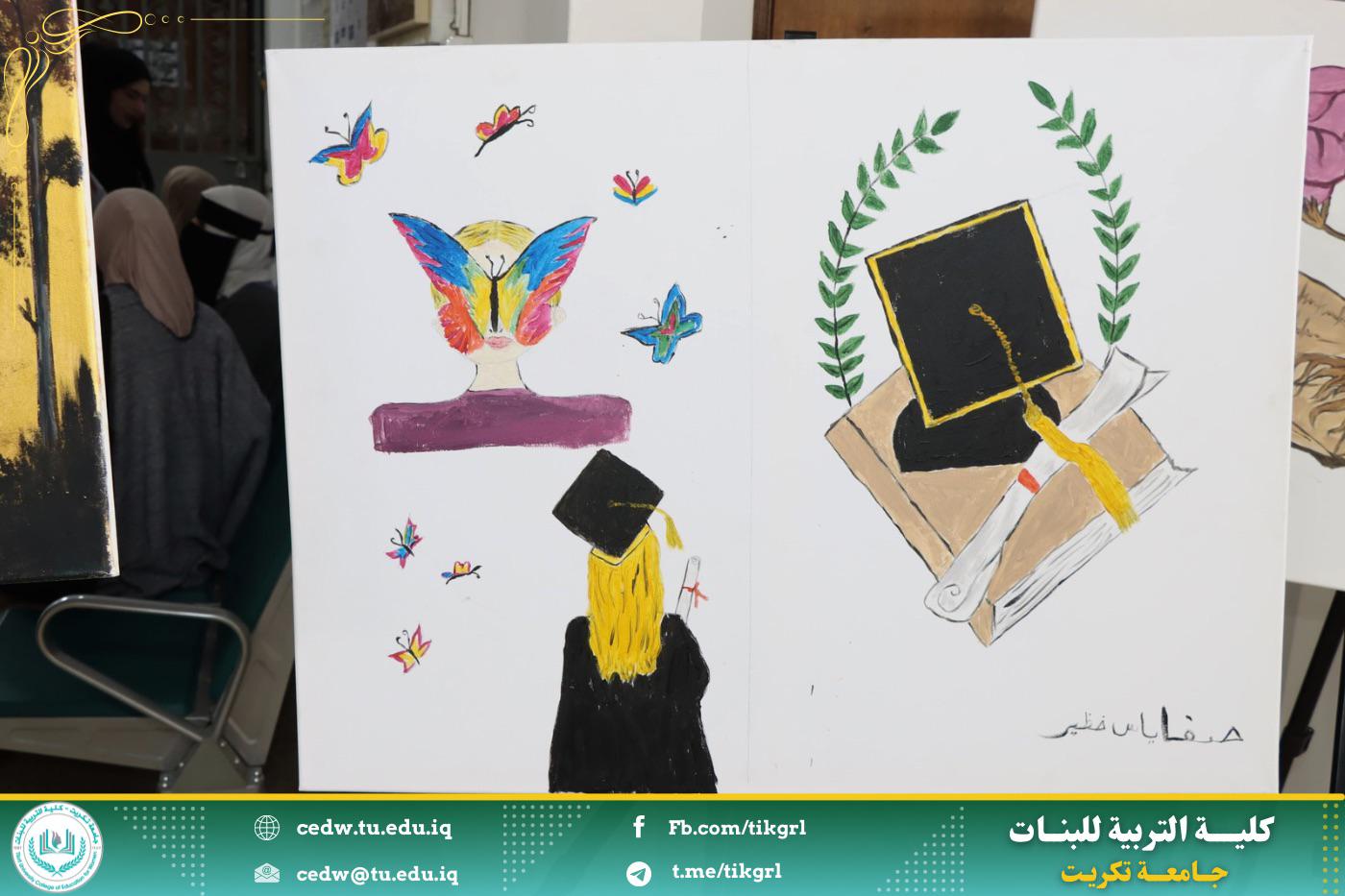 * عرضاً لللوحات الفنية التي توضح ان العلم هو غذاء العقل وان المرأة المتعلمة تفتح لها افاق كثيرة ومجالات عديدة تعزز من دورها بالمجمع