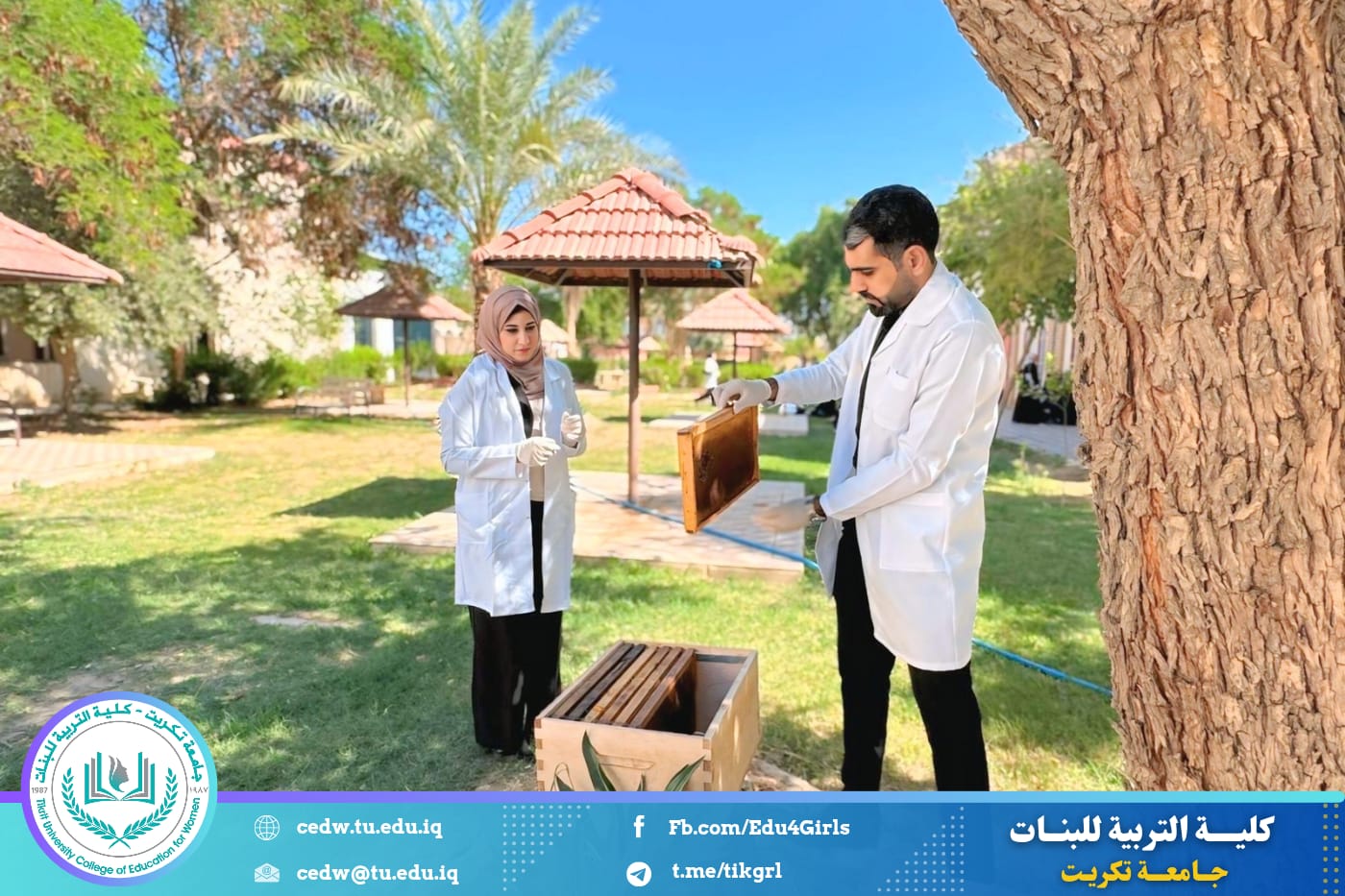 ضمن إطار النشاطات التطبيقية لقسم الاقتصاد المنزلي في كلية التربية للبنات – جامعة تكريت، أجرت المدرس شهد خالد حميد رئيس القسم، اليوم الثلاثاء الموافق ١٤ / ١٠ / ٢٠٢٥، وبالتعاون مع م.د. فلاح سالم داوود أحد تدريسي القسم، متابعة ميدانية لخلايا النحل الخاصة بالدرس العملي لتخصص الغذاء والتغذية.