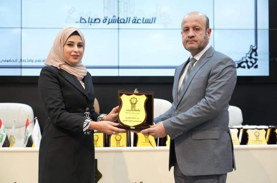 وفي ختام الاحتفالية تم تكريم مديرة شعبة ضمان الجودة والأداء الجامعي في كلية التربية للبنات، المدرس شهد خالد حميد وعدد من مسؤولي شعب واقسام الجودة في كليات الجامعة بدرع جامعة تكريت تقديراً لجهودهم المبذولة في رفع إسم الجامعة متمنياً لهم دوام التوفيق والنجاح.