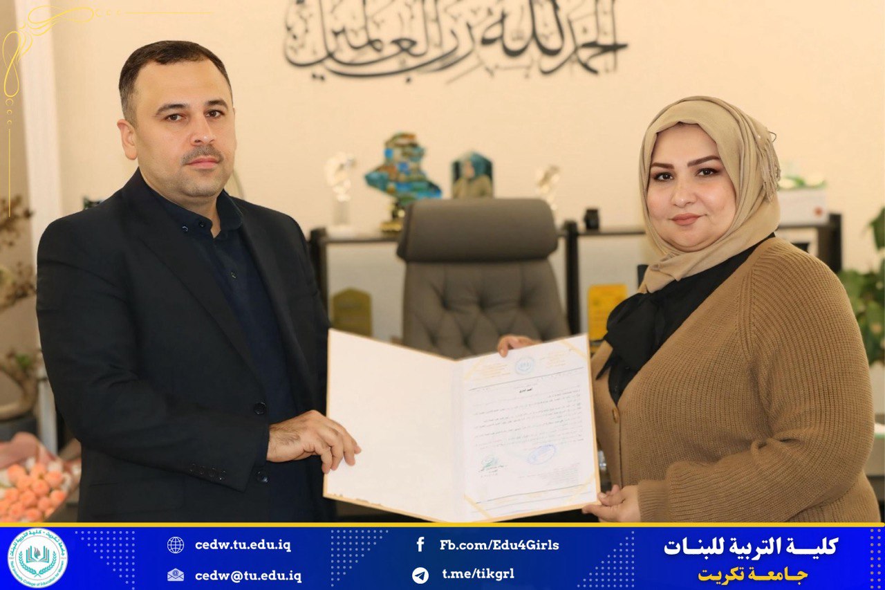 تتقدم عمادة كلية التربية للبنات متمثلة بعميدها الأستاذ الدكتورة نجلاء عبدالحسين عليوي ونيابة عن جميع منتسبي الكلية بأزكى التهاني والتبريكات للأستاذ المساعد الدكتور علي مؤيد سلطان بمناسبة تسنمه منصب رئيس قسم علوم الحياة في كليتنا متمنين له النجاح بمسيرته العلمية والوظيفية وان يعينه في مهام عمله الجديد ويسدد خطاه في استكمال المسيرة العلمية المميزة للارتقاء بواقع التعليم العالي في بلدنا العزيز نحو الأفضل .