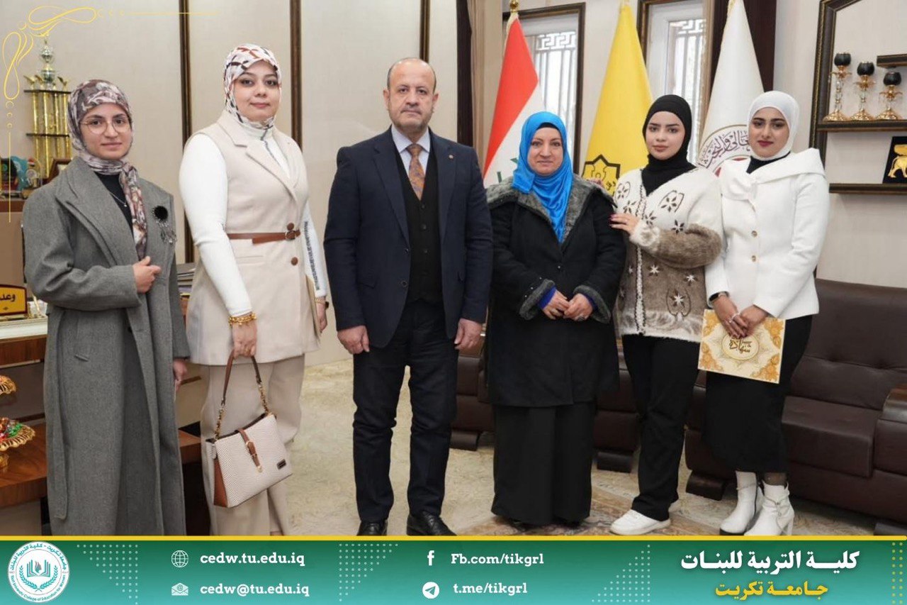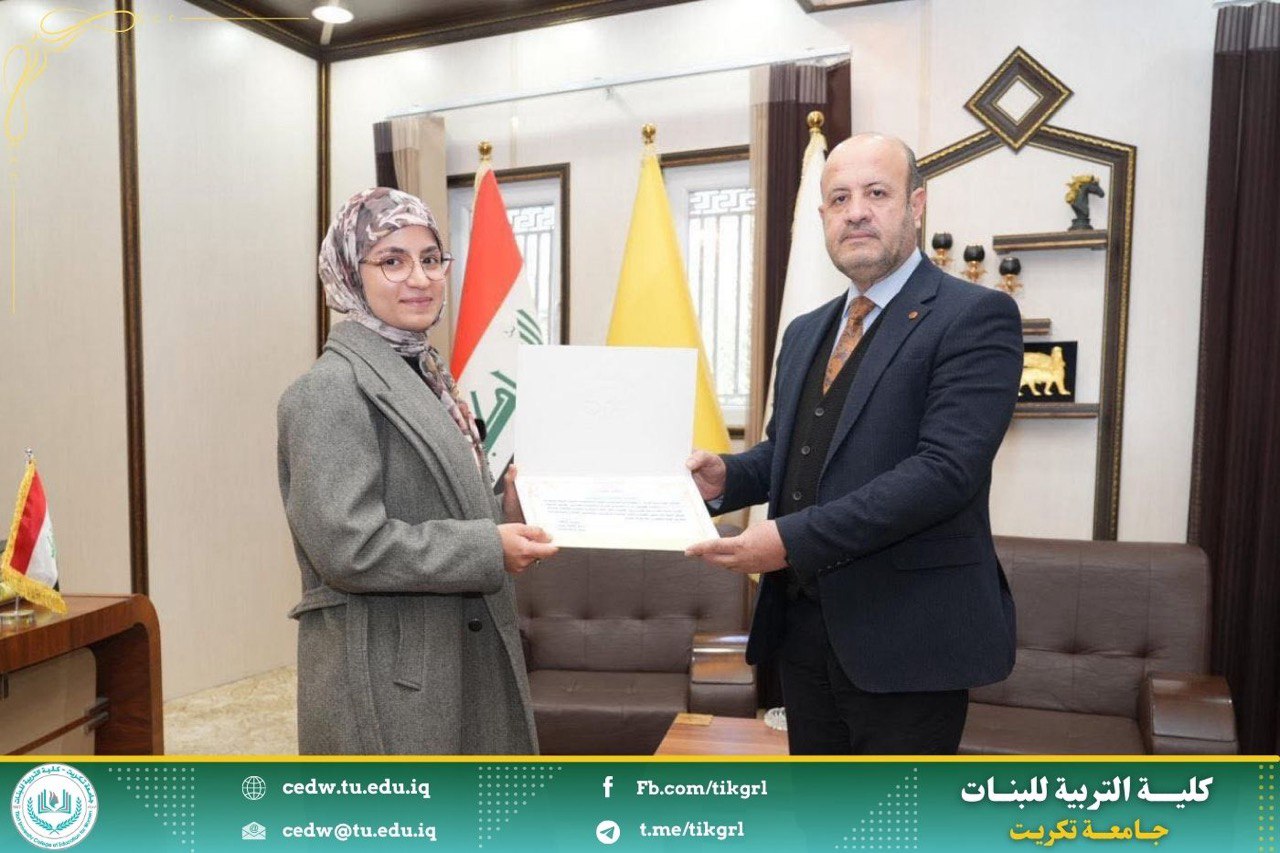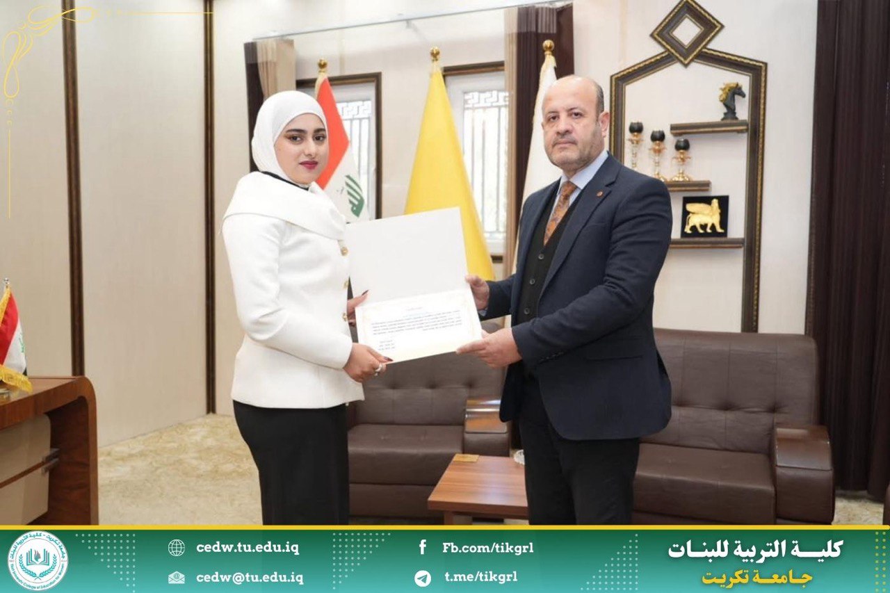 كرم رئيس جامعة تكريت الاستاذ الدكتور وعد محمود رؤوف طالبتان من كلية التربية للبنات لمشاركتهن المتميزة في المهرجان الأول للتنمية والإبداع الذي نظمه قسم شؤون المرأة في وزارة التعليم العالي والبحث العلمي