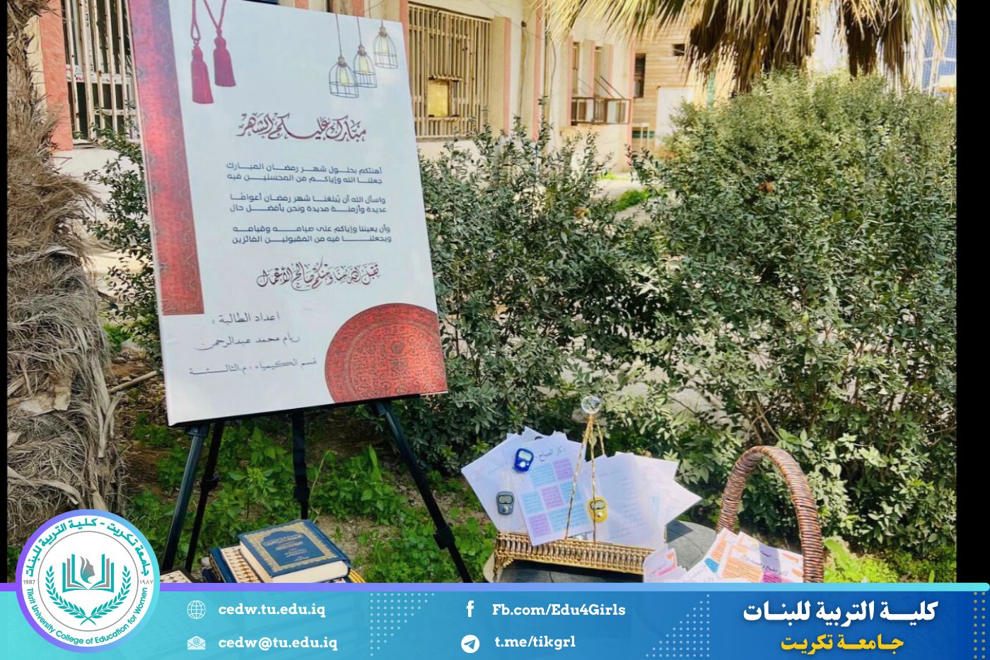 بمناسبة حلول شهر رمضان المبارك، نظّم قسم الكيمياء في كلية التربية للبنات مبادرة رمضانية مميزة، بإشراف السيدة رئيس القسم الأستاذ الدكتورة نادية احمد صالح ، وذلك في إطار تعزيز الأجواء الإيمانية وترسيخ روح الألفة والتآخي بين الطالبات ومنتسبي القسم.