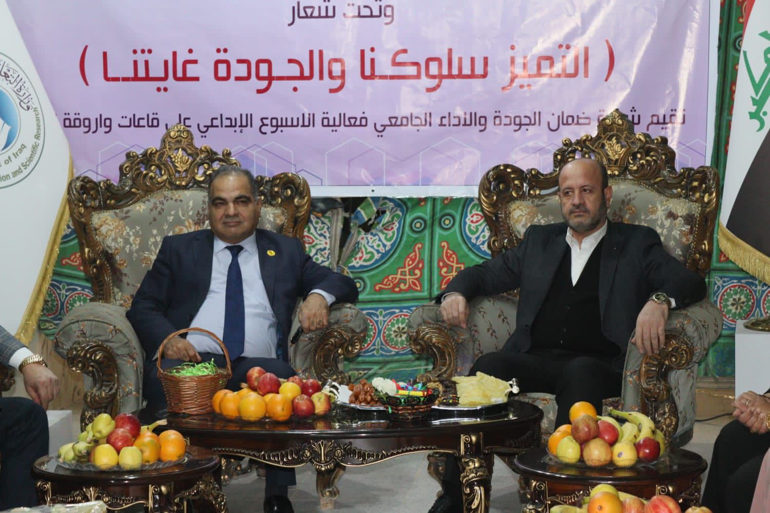ضمن فعاليات الأسبوع الإبداعي، شهدت كلية التربية للبنات فعالية خاصة نظمتها شعبة ضمان الجودة والأداء الجامعي بحضور الأستاذ الدكتور وعد محمود رؤوف، رئيس الجامعة، والاستاذ الدكتور حسن حسين ابراهيم، مساعد رئيس الجامعة للشؤون العلمية، والأستاذ الدكتور نجلاء عبد الحسين عليوي، عميد كلية التربية للبنات.