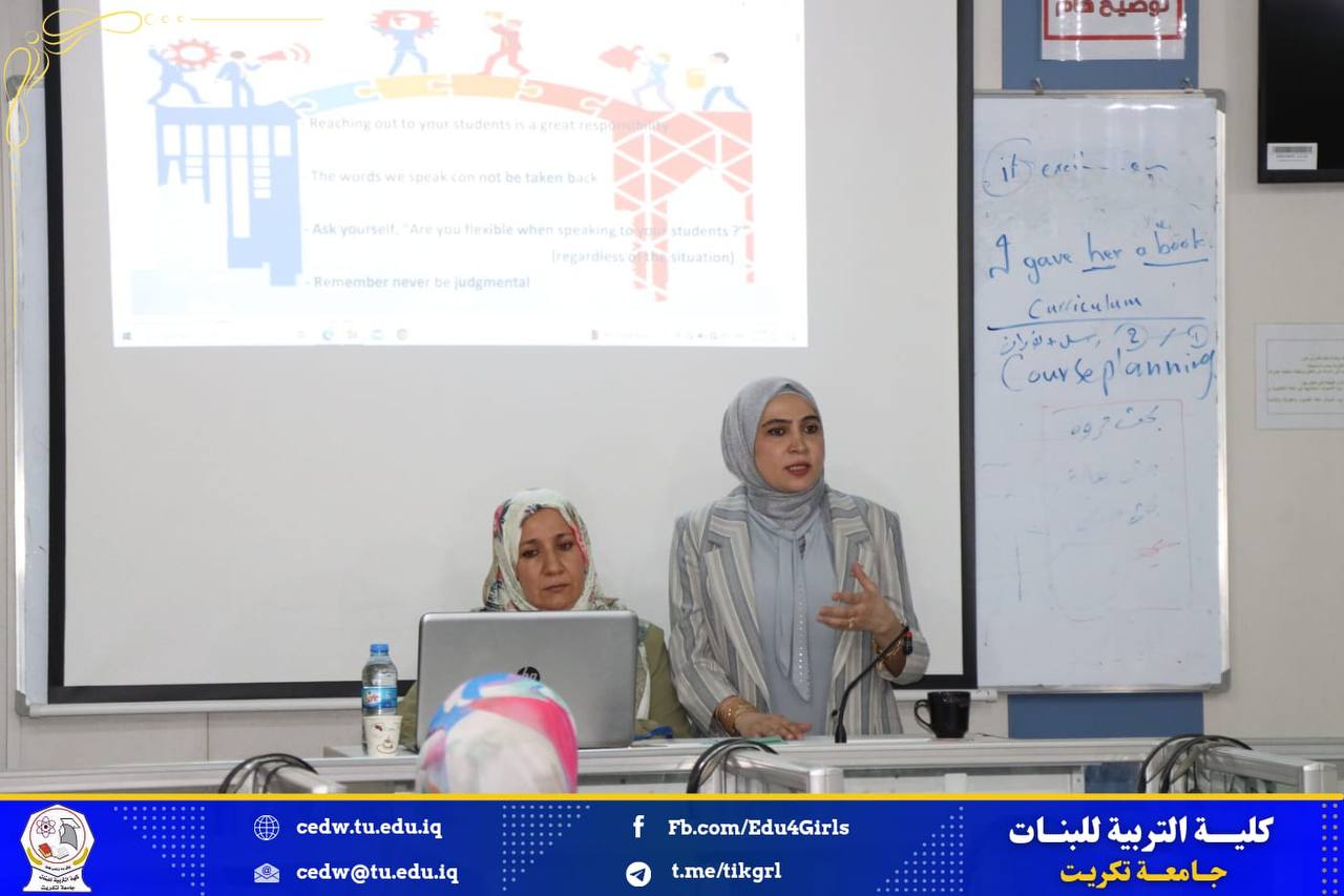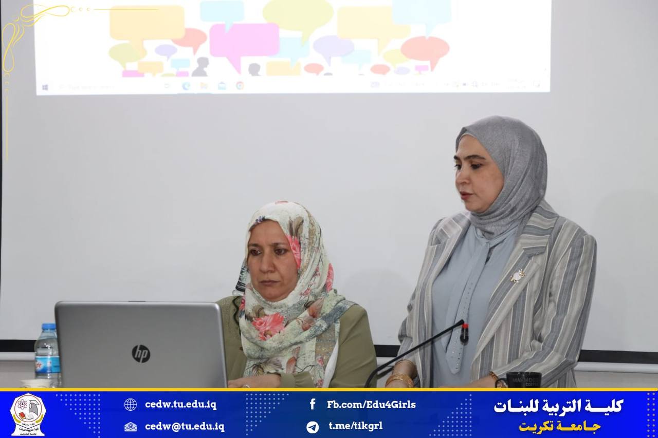 برعاية الأستاذ الدكتور وعد محمود رؤوف المحترم رئيس جامعة تكريت وبإشراف الأستاذ الدكتورة نجلاء عبدالحسين عليوي المحترمة عميد كلية التربية للبنات اقامت كلية التربية للبنات قسم اللغة الإنجليزية دورة تدريبية بعنوان :( How To Speak Effectively and Fluently to Communicate in online sessions)