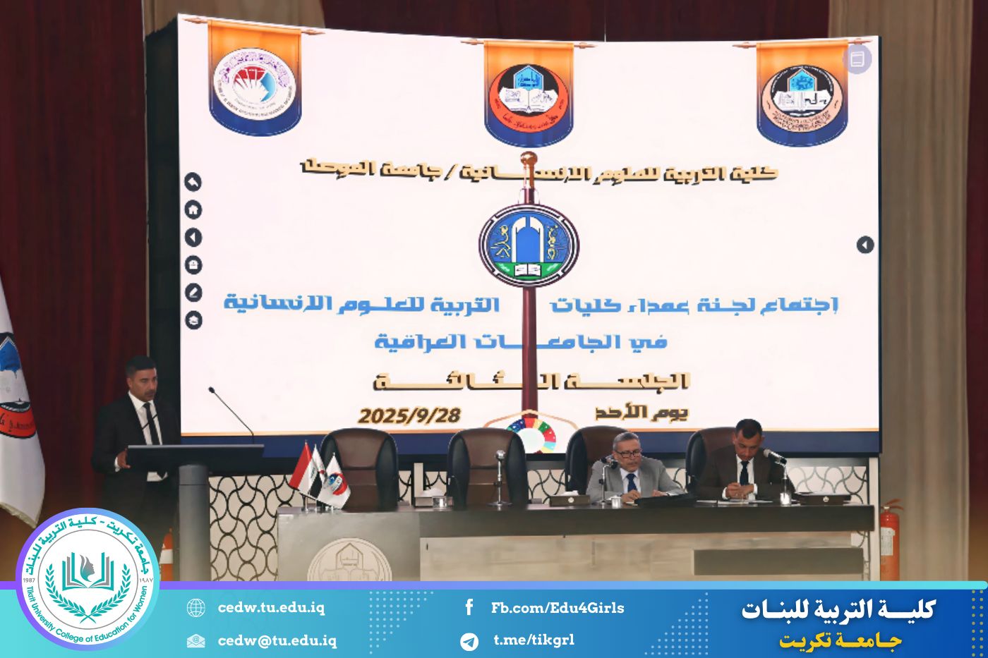 حضرت الأستاذ الدكتورة نجلاء عبدالحسين المحمداوي عميد كلية التربية للبنات – جامعة تكريت، اجتماع لجنة عمداء كليات التربية للعلوم الإنسانية في الجامعات العراقية، الذي عُقد في كلية التربية للعلوم الإنسانية – جامعة الموصل، في يوم الأحد الموافق (28 / 9 / 2025)، بمشاركة السادة العمداء وممثلي الجامعات.