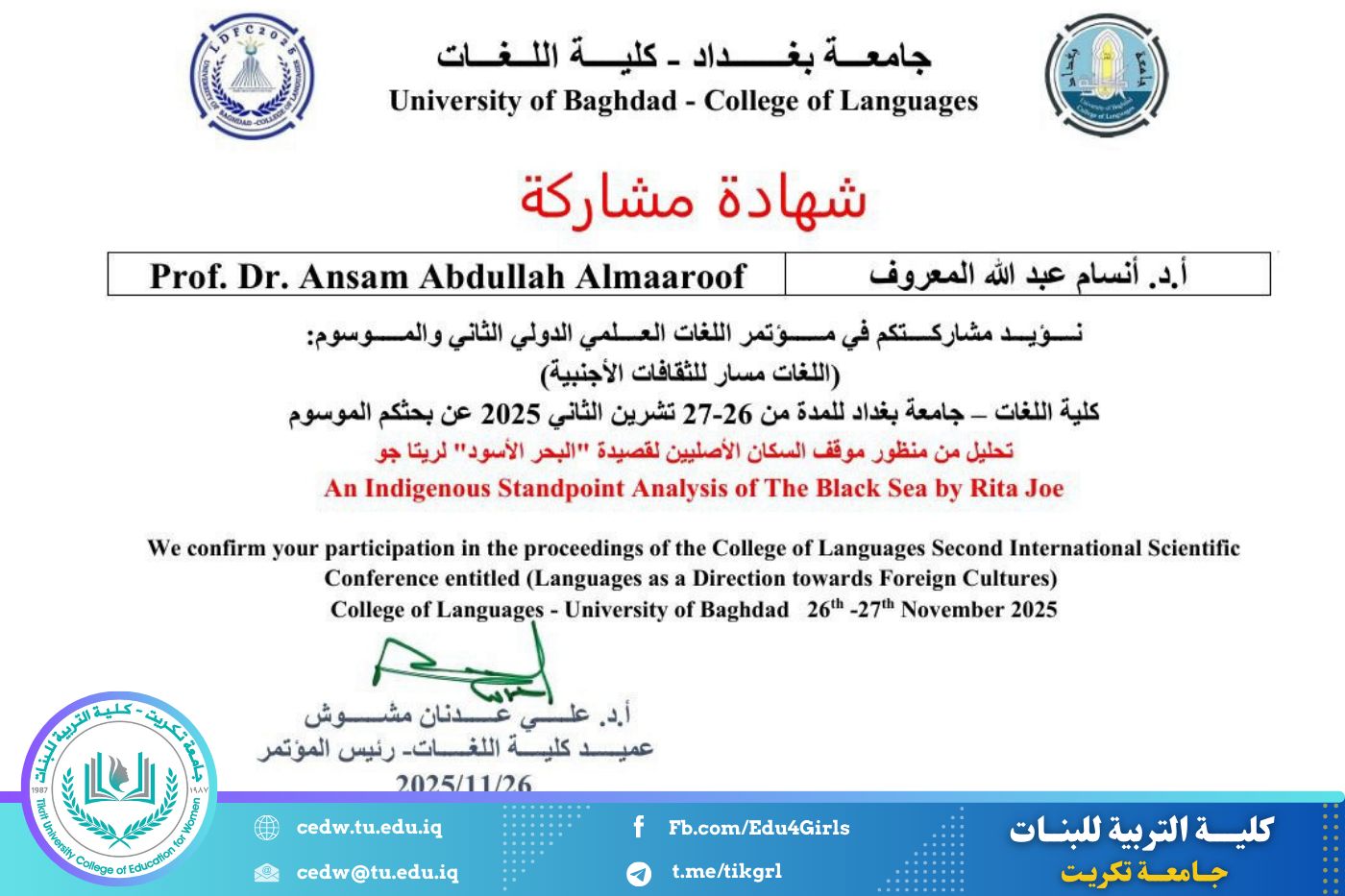 شاركت الأستاذ الدكتورة أنسام رياض عبد الله المعروف، التدريسية في قسم اللغة الإنكليزية بكلية التربية للبنات – جامعة تكريت، في أعمال المؤتمر العلمي الدولي الثاني لكلية اللغات – جامعة بغداد، الموسوم "اللغات مسار للثقافات الأجنبية"، والذي عُقد للفترة من 26 – 27 تشرين الثاني 2025، بمشاركة نخبة من الباحثين والمتخصصين من داخل العراق وخارجه.