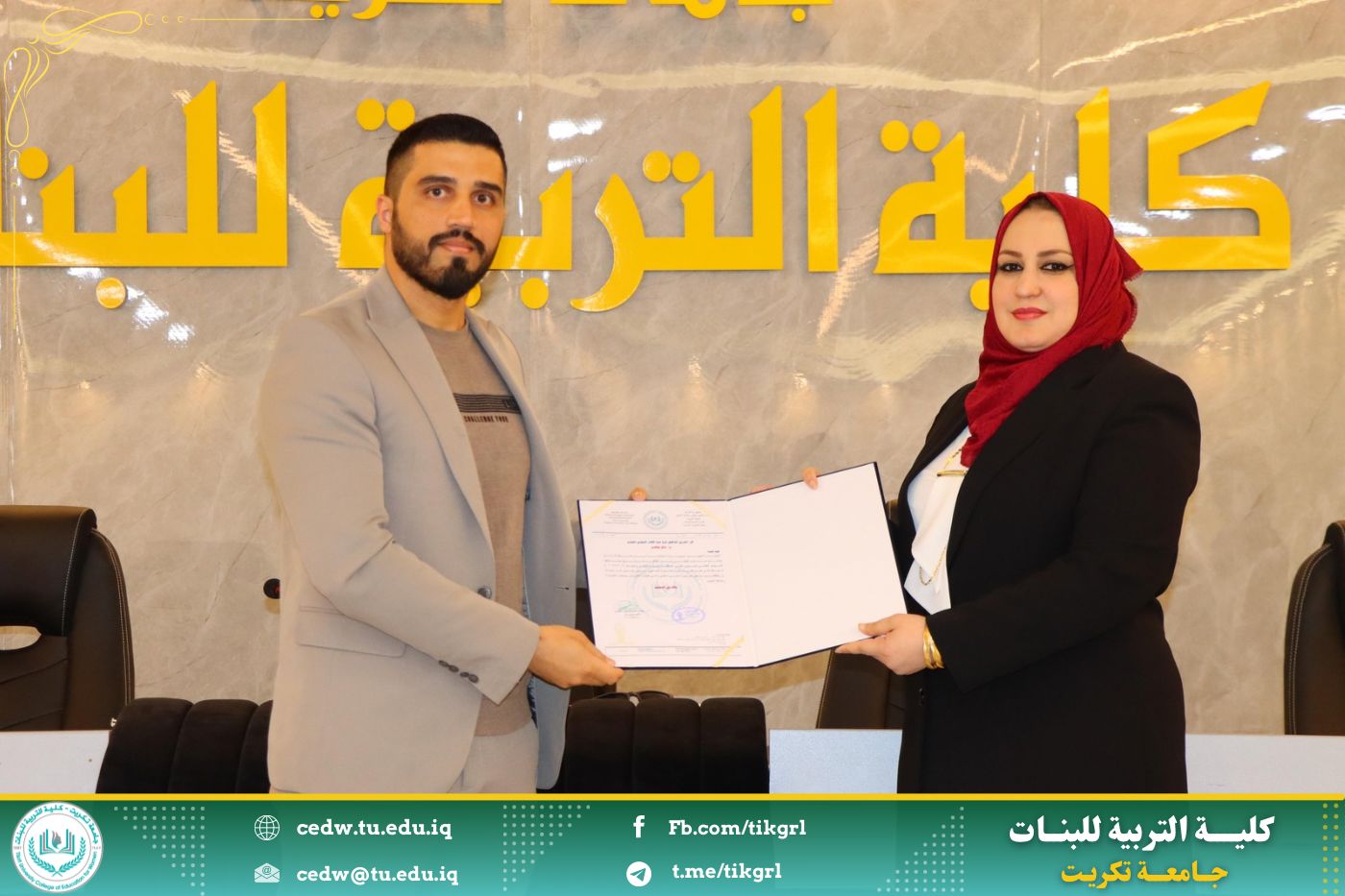 ٢- اريج كامل حميد / قسم العلوم التربوية والنفسية عن بحثها ( الإدارة المصرفية وعلاقتها بالاستحقاق الأكاديمي لدى طالبات العليا كلية التربية للبنات) بإشراف أ.د. نبيل عبدالعزيز عبدالكريم