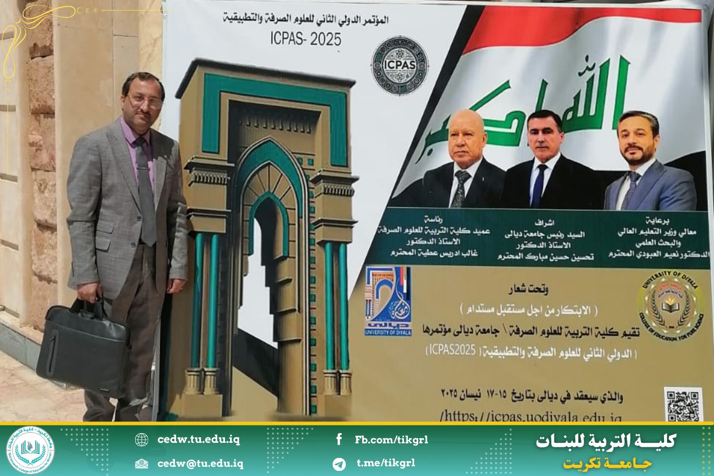 شارك الأستاذ الدكتور أحمد حسن رديني ( التدريسي في كلية التربية للبنات/ جامعة تكريت) في أعمال المؤتمر العلمي الدولي الثاني للعلوم الصرفة والتطبيقية المقام في كلية التربية للعلوم الصرفة - جامعة ديالى، تحت شعار ( الابتكار من أجل مستقبل مستدام )، وذلك عن بحثه الموسوم ( المعالجة الحيوية للتلوث العضوي باستخدام بكتيريا العصوية الرقيقة المُحددة جزيئيًا