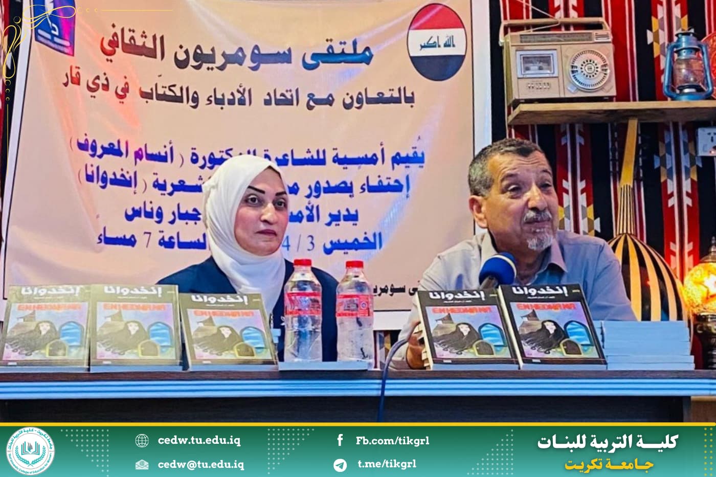 شاركت التدريسية في كلية التربية للبنات بجامعة تكريت الأستاذ الدكتورة انسام المعروف في ملتقى سومر الثقافي للاحتفاء بديوانها الشعري المعنون ( انخدوانا) الذي نظمه الملتقى بالتعاون مع اتحاد الأدباء والكتاب في محافظة ذي قار .