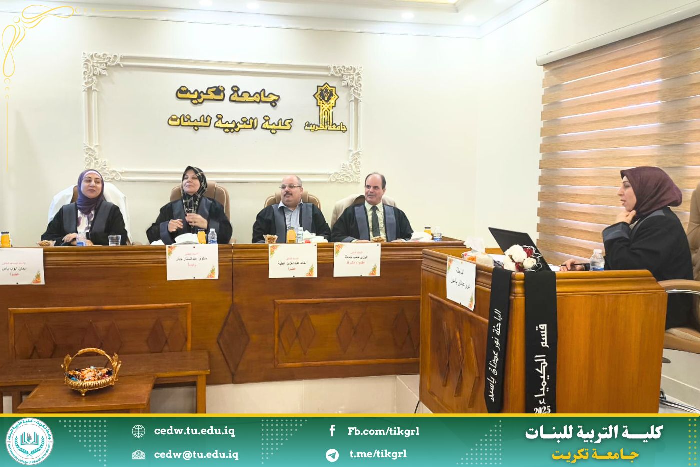 نوقشت في كلية التربية للبنات، قسم الكيمياء، اليوم الاثنين الموافق 11 / 8 / 2025، وعلى قاعة السمنار في الأقسام العلمية، رسالة الماجستير المقدّمة من الطالبة نور عدنان ياسين، والموسومة: