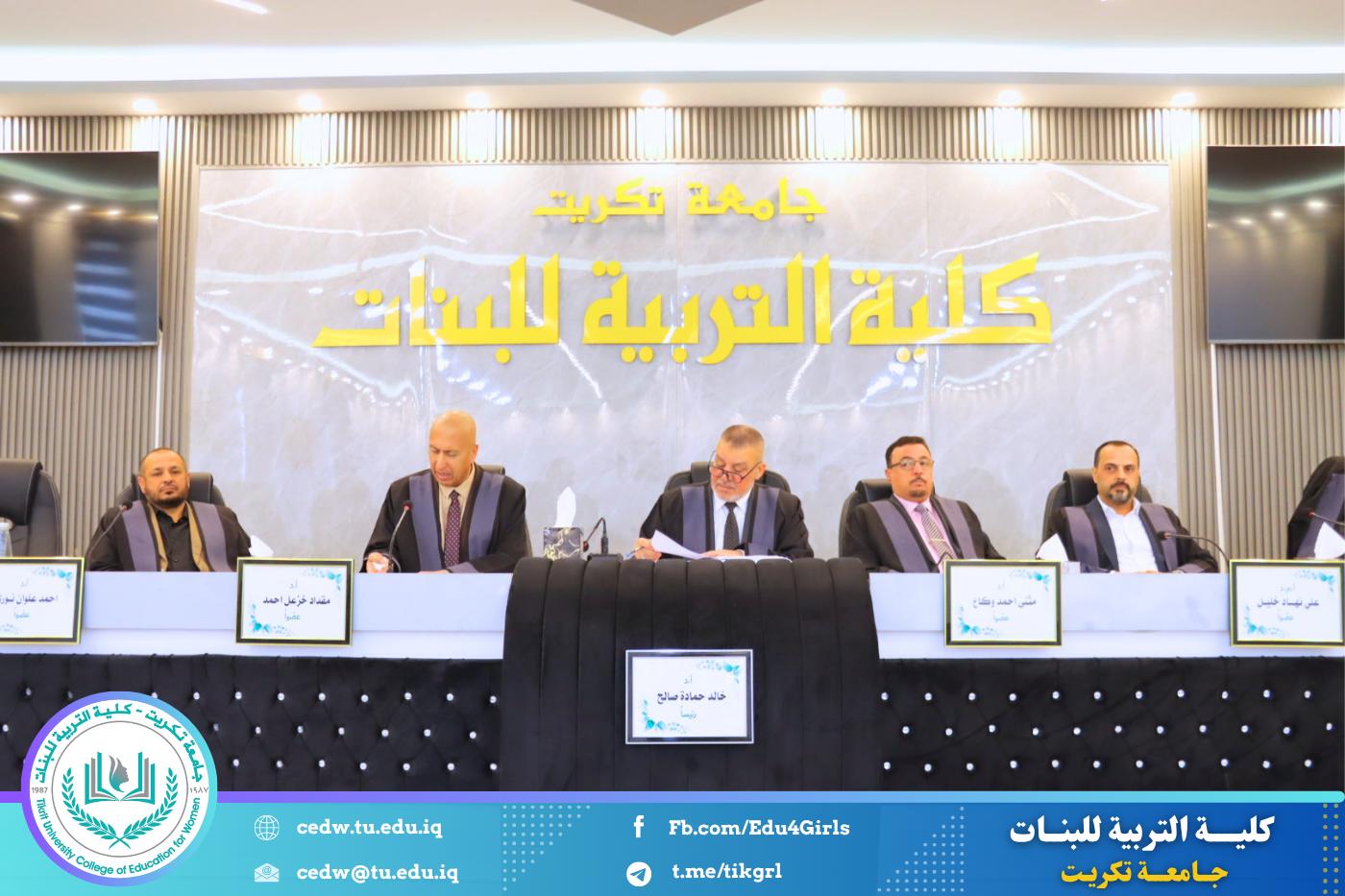 نوقشت في كلية التربية للبنات – قسم علوم القرآن، يوم الأربعاء الموافق 25 / 3 / 2026، وعلى قاعة المرحوم الأستاذ الدكتور جايد زيدان في عمادة الكلية، أطروحة الدكتوراه المقدّمة من الطالبة علياء تحسين دنون، والموسومة: