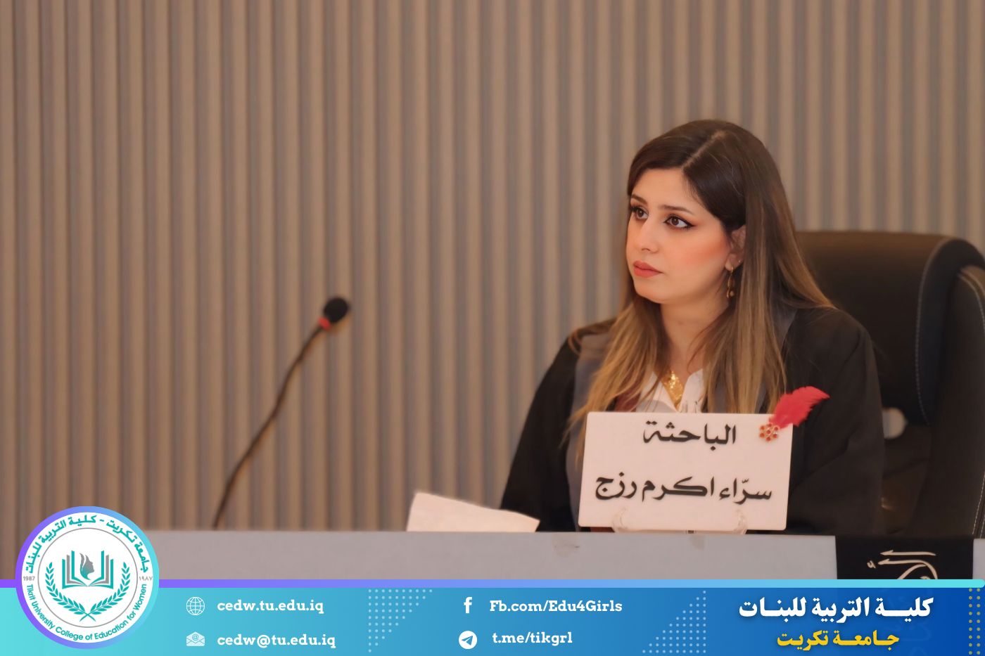 نوقشت في كلية التربية للبنات – قسم اللغة الإنجليزية، اليوم الأربعاء الموافق (19 / 11 / 2025)، على قاعة المرحوم الأستاذ الدكتور جايد زيدان في عمادة الكلية، رسالة الماجستير المقدّمة من الطالبة سرّاء أكرم رزج، والموسومة: